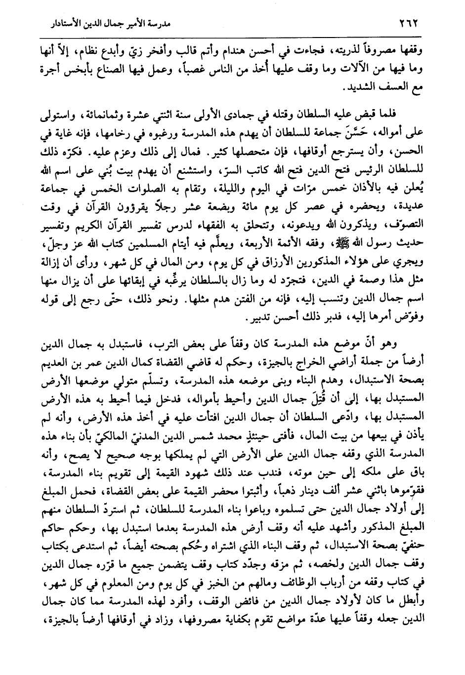وهو أنّ موضع هذه المدرسة كان وقفا على بعض الترب، فاستبدل به جمال الدين أرضا من جملة أراضي الخراج بالجيزة، وحكم له قاضي القضاة كمال الدين عمر بن العديم بصحة الاستبدال، وهدم البناء وبنى موضعه هذه المدرسة، وتسلّم متولي موضعها الأرض المستبدل بها، إلى أن قتل جمال الدين وأحيط بأمواله، فدخل فيما أحيط به هذه الأرض المستبدل بها، وادّعى السلطان أن جمال الدين افتأت عليه في أخذ هذه الأرض، وأنه لم يأذن في بيعها من بيت المال، فأفتى حينئذ محمد شمس الدين المدنيّ المالكيّ بأن بناء هذه المدرسة الذي وقفه جمال الدين على الأرض التي لم يملكها بوجه صحيح لا يصح، وأنه باق على ملكه إلى حين موته، فندب عند ذلك شهود القيمة إلى تقويم بناء المدرسة، فقوّموها باثني عشر ألف دينار ذهبا، وأثبتوا محضر القيمة على بعض القضاة، فحمل المبلغ إلى أولاد جمال الدين حتى تسلموه وباعوا بناء المدرسة للسلطان، ثم استردّ السلطان منهم المبلغ المذكور وأشهد عليه أنه وقف أرض هذه المدرسة بعد ما استبدل بها، وحكم حاكم حنفيّ بصحة الاستبدال، ثم وقف البناء الذي اشتراه وحكم بصحته أيضا، ثم استدعى بكتاب وقف جمال الدين ولخصه، ثم مزقه وجدّد كتاب وقف يتضمن جميع ما قرّره جمال الدين في كتاب وقفه من أرباب الوظائف ومالهم من الخبز في كل يوم ومن المعلوم في كل شهر، وأبطل ما كان لأولاد جمال الدين من فائض الوقف، وأفرد لهذه المدرسة مما كان جمال الدين جعله وقفا عليها عدّة مواضع تقوم بكفاية مصروفها، وزاد في أوقافها أرضا بالجيزة،