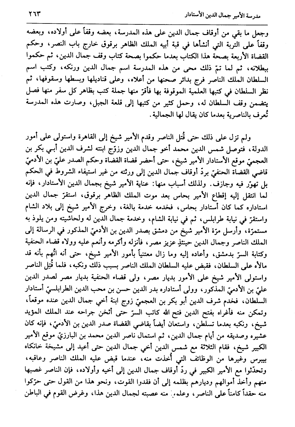 وجعل ما بقي من أوقاف جمال الدين على هذه المدرسة، بعضه وقفا على أولاده، وبعضه وقفا على التربة التي أنشأها في قبة أبيه الملك الظاهر برقوق خارج باب النصر، وحكم القضاة الأربعة بصحة هذا الكتاب بعد ما حكموا بصحة كتاب وقف جمال الدين، ثم حكموا ببطلانه، ثم لما تمّ ذلك محى من هذه المدرسة اسم جمال الدين ورنكه، وكتب اسم السلطان الملك الناصر فرج بدائر صحنها من أعلاه، وعلى قناديلها وبسطها وسقوفها، ثم نظر السلطان في كتبها العلمية الموقوفة بها فأقرّ منها جملة كتب بظاهر كل سفر منها فصل يتضمن وقف السلطان له، وحمل كثير من كتبها إلى قلعة الجبل، وصارت هذه المدرسة تعرف بالناصرية بعد ما كان يقال لها الجمالية.
