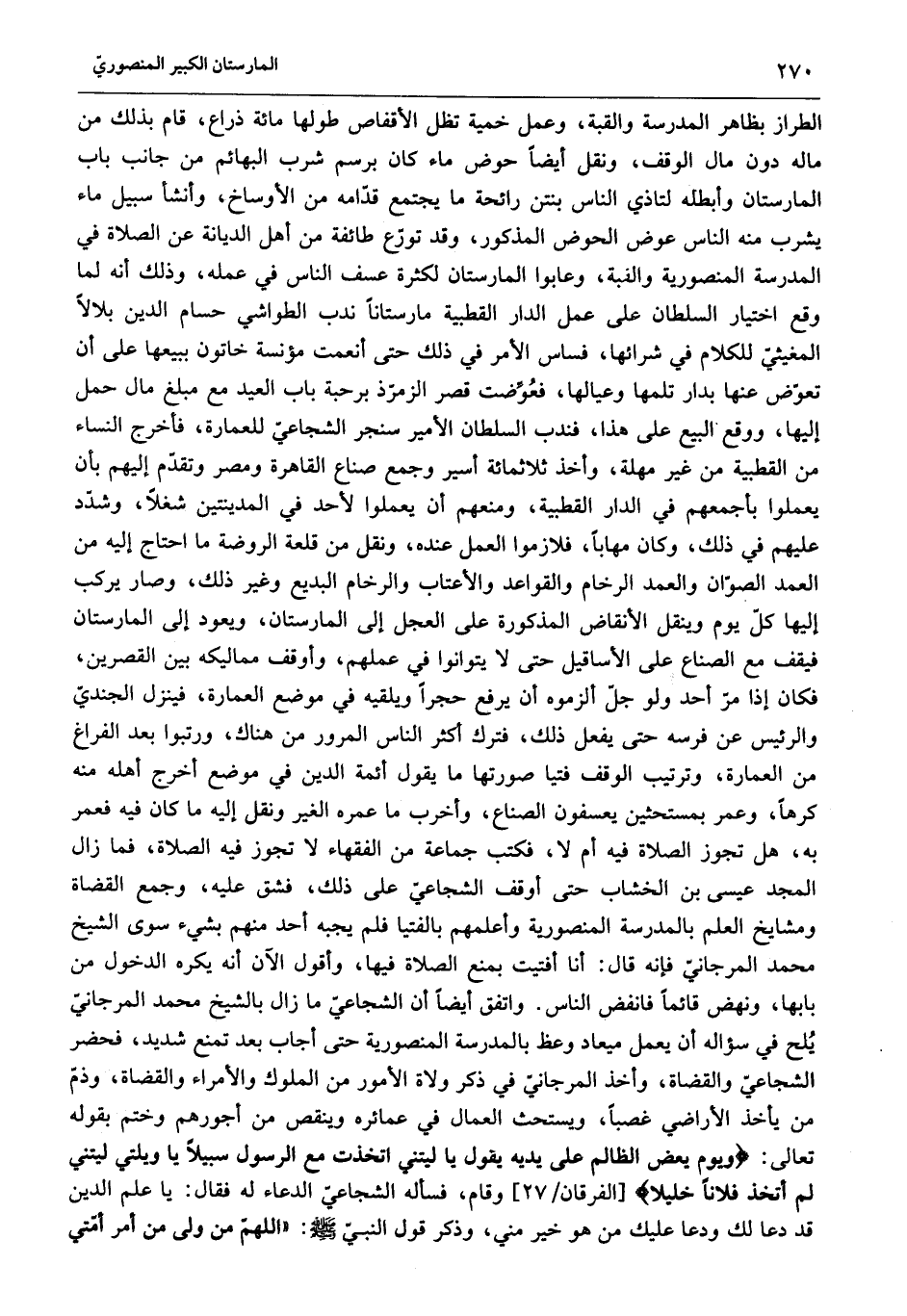 الطراز بظاهر المدرسة والقبة، وعمل خمية تظل الأقفاص طولها مائة ذراع، قام بذلك من ماله دون مال الوقف، ونقل أيضا حوض ماء كان برسم شرب البهائم من جانب باب المارستان وأبطله لتاذي الناس بنتن رائحة ما يجتمع قدّامه من الأوساخ، وأنشأ سبيل ماء يشرب منه الناس عوض الحوض المذكور، وقد تورّع طائفة من أهل الديانة عن الصلاة في المدرسة المنصورية والقبة، وعابوا المارستان لكثرة عسف الناس في عمله، وذلك أنه لما وقع اختيار السلطان على عمل الدار القطبية مارستانا ندب الطواشي حسام الدين بلالا المغيثيّ للكلام في شرائها، فساس الأمر في ذلك حتى أنعمت مؤنسة خاتون ببيعها على أن تعوّض عنها بدار تلمها وعيالها، فعوّضت قصر الزمرّذ برحبة باب العيد مع مبلغ مال حمل إليها، ووقع البيع على هذا، فندب السلطان الأمير سنجر الشجاعيّ للعمارة، فأخرج النساء من القطبية من غير مهلة، وأخذ ثلاثمائة أسير وجمع صناع القاهرة ومصر وتقدّم إليهم بأن يعملوا بأجمعهم في الدار القطبية، ومنعهم أن يعملوا لأحد في المدينتين شغلا، وشدّد عليهم في ذلك، وكان مهابا، فلازموا العمل عنده، ونقل من قلعة الروضة ما احتاج إليه من العمد الصوّان والعمد الرخام والقواعد والأعتاب والرخام البديع وغير ذلك، وصار يركب إليها كلّ يوم وينقل الأنقاض المذكورة على العجل إلى المارستان، ويعود إلى المارستان فيقف مع الصناع على الأساقيل حتى لا يتوانوا في عملهم، وأوقف مماليكه بين القصرين، فكان إذا مرّ أحد ولو جلّ ألزموه أن يرفع حجرا ويلقيه في موضع العمارة، فينزل الجنديّ والرئيس عن فرسه حتى يفعل ذلك، فترك أكثر الناس المرور من هناك، ورتبوا بعد الفراغ من العمارة، وترتيب الوقف فتيا صورتها ما يقول أئمة الدين في موضع أخرج أهله منه كرها، وعمر بمستحثين يعسفون الصناع، وأخرب ما عمره الغير ونقل إليه ما كان فيه فعمر به، هل تجوز الصلاة فيه أم لا، فكتب جماعة من الفقهاء لا تجوز فيه الصلاة، فما زال المجد عيسى بن الخشاب حتى أوقف الشجاعيّ على ذلك، فشق عليه، وجمع القضاة ومشايخ العلم بالمدرسة المنصورية وأعلمهم بالفتيا فلم يجبه أحد منهم بشيء سوى الشيخ محمد المرجانيّ فإنه قال: أنا أفتيت بمنع الصلاة فيها، وأقول الآن أنه يكره الدخول من بابها، ونهض قائما فانفض الناس. واتفق أيضا أن الشجاعيّ ما زال بالشيخ محمد المرجانيّ، يلح في سؤاله أن يعمل ميعاد وعظ بالمدرسة المنصورية حتى أجاب بعد تمنع شديد، فحضر الشجاعيّ والقضاة، وأخذ المرجانيّ في ذكر ولاة الأمور من الملوك والأمراء والقضاة، وذمّ من يأخذ الأراضي غصبا، ويستحث العمال في عمائره وينقص من أجورهم وختم بقوله تعالى: وَيَوْمَ يَعَضُّ الظَّالِمُ عَلى يَدَيْهِ يَقُولُ يا لَيْتَنِي اتَّخَذْتُ مَعَ الرَّسُولِ سَبِيلًا يا وَيْلَتى لَيْتَنِي لَمْ أَتَّخِذْ فُلاناً خَلِيلًا