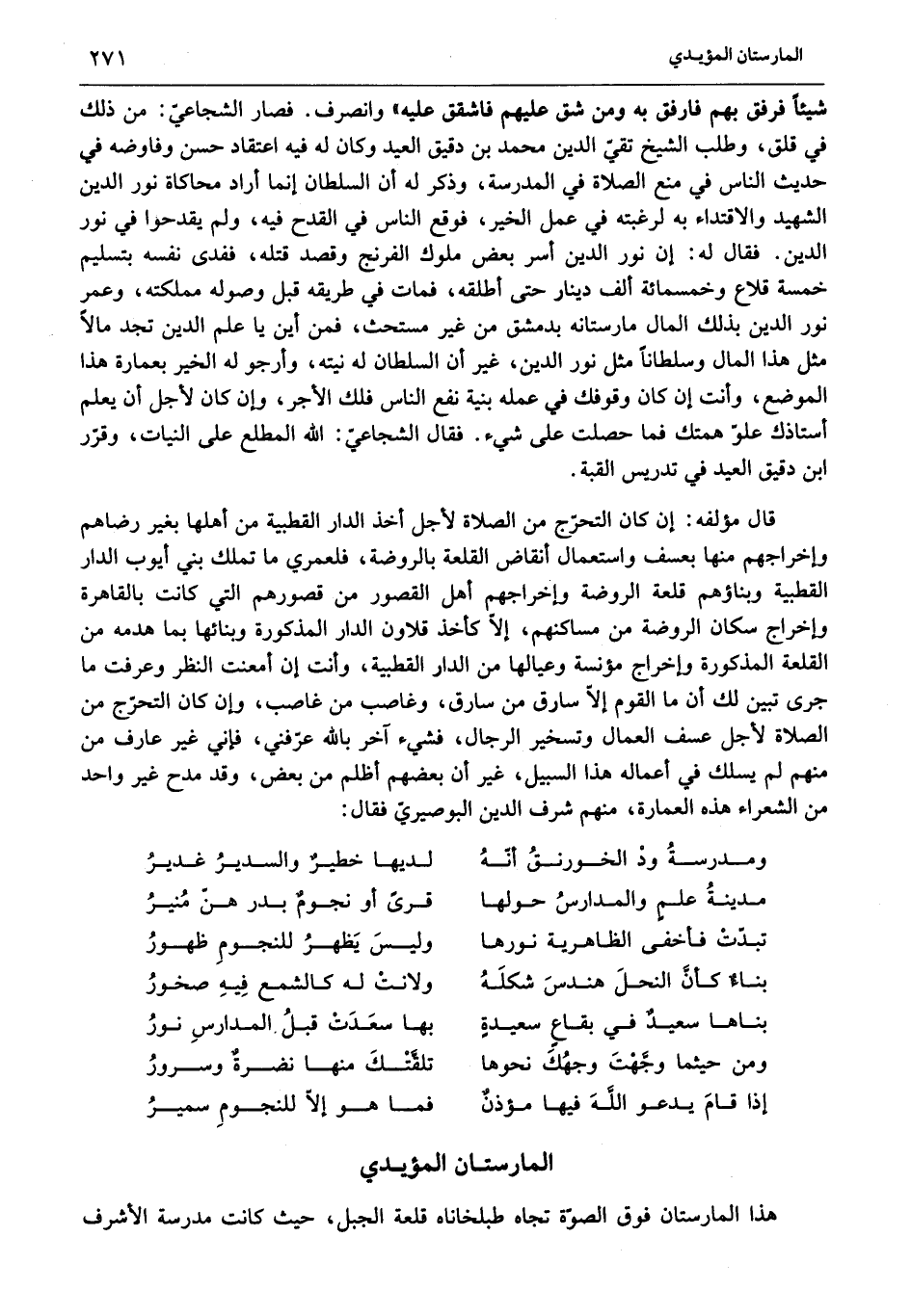 شيئا فرفق بهم فارفق به ومن شق عليهم فاشقق عليه» وانصرف. فصار الشجاعيّ: من ذلك في قلق، وطلب الشيخ تقيّ الدين محمد بن دقيق العيد وكان له فيه اعتقاد حسن وفاوضه في حديث الناس في منع الصلاة في المدرسة، وذكر له أن السلطان إنما أراد محاكاة نور الدين الشهيد والاقتداء به لرغبته في عمل الخير، فوقع الناس في القدح فيه، ولم يقدحوا في نور الدين. فقال له: إن نور الدين أسر بعض ملوك الفرنج وقصد قتله، ففدى نفسه بتسليم خمسة قلاع وخمسمائة ألف دينار حتى أطلقه، فمات في طريقه قبل وصوله مملكته، وعمر نور الدين بذلك المال مارستانه بدمشق من غير مستحث، فمن أين يا علم الدين تجد مالا مثل هذا المال وسلطانا مثل نور الدين، غير أن السلطان له نيته، وأرجو له الخير بعمارة هذا الموضع، وأنت إن كان وقوفك في عمله بنية نفع الناس فلك الأجر، وإن كان لأجل أن يعلم أستاذك علوّ همتك فما حصلت على شيء. فقال الشجاعيّ: الله المطلع على النيات، وقرّر ابن دقيق العيد في تدريس القبة.