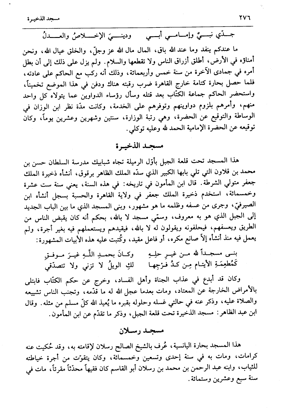 هذا المسجد بحارة اليانسية، عرف بالشيخ الصالح رسلان لإقامته به، وقد حكيت عنه كرامات، ومات به في سنة إحدى وتسعين وخمسمائة، وكان يتقوّت من أجرة خياطته للثياب، وابنه عبد الرحمن بن محمد بن رسلان أبو القاسم كان فقيها محدّثا مقرئا، مات في سنة سبع وعشرين وستمائة.
