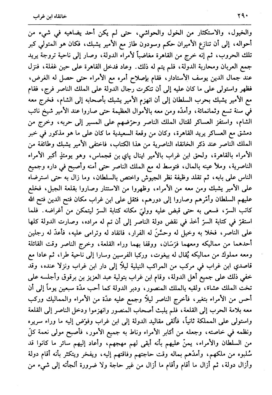 والخيول، والاستكثار من الخول والحواشي، حتى لم يكن أحد يضاهيه في شيء من أحواله، إلى أن تنازع الأميران حكم وسودون طاز مع الأمير يشبك، فكان هو المتولي كبر تلك الحروب، ثم إنه خرج من القاهرة مغاضبا لأمراء الدولة، وصار إلى ناحية تروجة يريد جمع العربان ومحاربة الدولة، فلم يتم له ذلك. وعاد فدخل القاهرة على حين غفلة، فنزل عند جمال الدين يوسف الأستادار، فقام بإصلاح أمره مع الأمراء حتى حصل له الغرض، فظهر واستولى على ما كان عليه إلى أن تنكرت رجال الدولة على الملك الناصر فرج، فقام مع الأمير يشبك بحرب السلطان إلى أن انهزم الأمير يشبك بأصحابه إلى الشام، فخرج معه في سنة تسع وثمانمائة، وأمدّه ومن معه بالأموال العظيمة حتى صاروا عند الأمير شيخ نائب الشام، واستفز العساكر لقتال الملك الناصر وحرّضهم على المسير إلى حربه، وخرج من دمشق مع العساكر يريد القاهرة، وكان من وقعة السعيدية ما كان على ما هو مذكور في خبر الملك الناصر عند ذكر الخانقاه الناصرية من هذا الكتاب، فاختفى الأمير يشبك وطائفة من الأمراء بالقاهرة، ولحق ابن غراب بالأمير اينال پاي بن قجماس، وهو يومئذ أكبر الأمراء الناصرية، وملأ عينه بالمال، فتوسط له مع الملك الناصر حتى أمنه وأصبح في داره وجميع الناس على بابه، ثم تقلد وظيفة نظر الجيوش واختص بالسلطان، وما زال به حتى استرضاه على الأمير يشبك ومن معه من الأمراء، وظهروا من الاستتار وصاروا بقلعة الجبل، فخلع عليهم السلطان وأمّرهم وصاروا إلى دورهم، فثقل على ابن غراب مكان فتح الدين فتح الله كاتب السرّ، فسعى به حتى قبض عليه وولي مكانه كتابة السرّ ليتمكن من أغراضه. فلما استقرّ في كتابة السرّ أخذ في نقض دولة الناصر إلى أن تم له مراده، وصارت الدولة كلها على الناصر، فخلا به وخيل له وحسّن له الفرار، فانقاد له وترامى عليه، فأعدّ له رجلين أحدهما من مماليكه ومعهما فرسان، ووقفا بهما وراء القلعة، وخرج الناصر وقت القائلة ومعه مملوك من مماليكه يقال له بيغوت، وركبا الفرسين وسارا إلى ناحية طرا، ثم عادا مع قاصدي ابن غراب في مركب من المراكب النيلية ليلا إلى دار ابن غراب ونزلا عنده، وقد خفي ذلك على جميع أهل الدولة، وقام ابن غراب بتولية عبد العزيز بن برقوق وأجلسه على تخت الملك عشاء، ولقبه بالملك المنصور، ودبر الدولة كما أحب مدّة سبعين يوما إلى أن أحس من الأمراء بتغير، فأخرج الناصر ليلا وجمع عليه عدّة من الأمراء والمماليك وركب معه بلامة الحرب إلى القلعة، فلم يلبث أصحاب المنصور وانهزموا ودخل الناصر إلى القلعة واستولى على المملكة ثانيا، فألقى مقاليد الدولة إلى ابن غراب وفوّض إليه ما وراء سريره ونظمه في خاصته، وجعله من أكابر الأمراء وناط به جميع الأمور، فأصبح مولى نعمة كلّ من السلطان والأمراء، يمنّ عليهم بأنه أبقى لهم مهجهم، وأعاد إليهم سائر ما كانوا قد سلبوه من ملكهم، وأمدّهم بما له وقت حاجتهم وفاقتهم إليه، ويفخر ويتكثر بأنه أقام دولة وأزال دولة، ثم أزال ما أقام وأقام ما أزال من غير حاجة ولا ضرورة ألجأته إلى شيء من