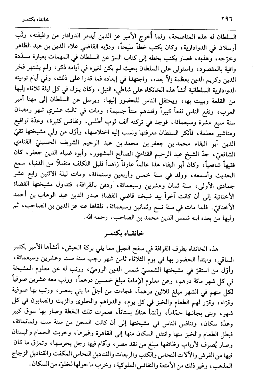 السلطان له هذه المناصحة، ولما أخرج الأمير عز الدين أيدمر الدوادار من وظيفته، رتّب أرسلان في الدوادارية، وكان يكتب خطا مليحا، ودرّبه القاضي علاء الدين بن عبد الظاهر وخرّجه، وهذبه، فصار يكتب بخطه إلى كتاب السرّ عن السلطان في المهمات بعبارة مسدّدة وافية بالمقصود، واستولى على السلطان بحيث لم يكن لغيره في أيامه ذكر، ولم يشتهر فخر الدين وكريم الدين بعظمة إلّا بعده، واجتهدا في إبعاده فما قدرا على ذلك، وفي أيام توليته الدوادارية السلطانية أنشأ هذه الخانكاه على شاطيء النيل، وكان ينزل في كل ليلة ثلاثاء إليها من القلعة ويبيت بها، ويحتفل الناس للحضور إليها، ويرسل عن السلطان إلى مهنا أمير العرب، ونفع الناس نفعا كبيرا وقلدهم مننا جسيمة، ومات في ثالث عشري شهر رمضان سنة سبع عشرة وسبعمائة، فوجد في تركته ألف ثوب أطلس، ونفائس كثيرة، وعدّة تواقيع ومناشير معلمة، فأنكر السلطان معرفتها ونسب إليها اختلاسها، وأوّل من ولي مشيختها تقيّ الدين أبو البقاء محمد بن جعفر بن محمد بن عبد الرحيم الشريف الحسينيّ القنائي الشافعيّ، جدّ الشيخ عبد الرحيم القنائيّ الصالح المشهور، وأبوه ضياء الدين جعفر، كان فقيها شافعيا، وكان أبو البقاء هذا عالما عارفا زاهدا قليل التكلف متقللا من الدنيا، سمع الحديث وأسمعه، وولد في سنة خمس وأربعين وستمائة، ومات ليلة الاثنين رابع عشر جمادى الأولى، سنة ثمان وعشرين وسبعمائة، ودفن بالقرافة، فتداول مشيختها القضاة الأخنائية إلى أن كانت آخرا بيد شيخنا قاضي القضاة صدر الدين عبد الوهاب بن أحمد الأخنائيّ. فلما مات في سنة تسع وثمانين وسبعمائة، تلقاها عنه عز الدين بن الصاحب، ثم وليها من بعده ابنه شمس الدين محمد بن الصاحب، رحمه الله.
