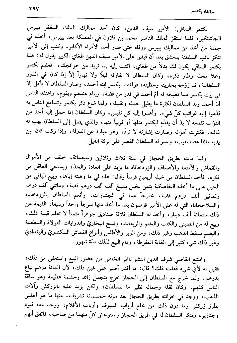 وامتنع القاضي شرف الدين النشو ناظر الخاص من حضور البيع واستعفى من ذلك، فقيل له لأيّ شيء فعلت ذلك؟ قال: ما أقدر أصبر على غبن ذلك، لأن المائة درهم تباع بدرهم. ولما خرج مع السلطان إلى الحجاز خرج بتجمل زائد وحشمة عظيمة وهو ساقة الناس كلهم، وكان ثقله وجماله نظير ما للسلطان، ولكن يزيد عليه بالزركش وآلات الذهب، ووجد في خزانته بطريق الحجاز بعد موته خمسمائة تشريف، منها ما هو أطلس بطرز زركش وما دون ذلك من خلع أرباب السيوف وأرباب الأقلام، ووجد معه قيود وجنازير، وتنكر السلطان له في طريق الحجاز واستوحش كلّ منهما من صاحبه، فاتفق أنهم