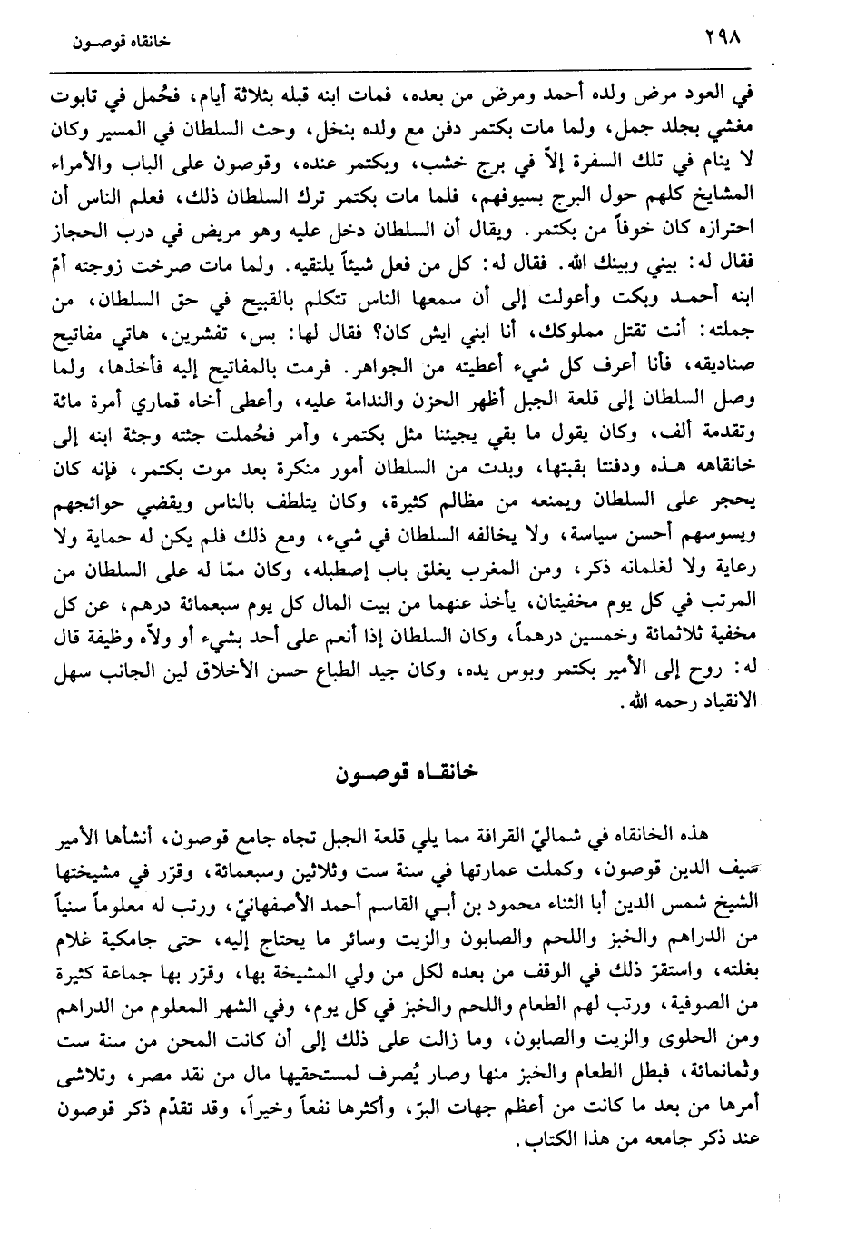 هذه الخانقاه في شماليّ القرافة مما يلي قلعة الجبل تجاه جامع قوصون، أنشأها الأمير سيف الدين قوصون، وكملت عمارتها في سنة ست وثلاثين وسبعمائة، وقرّر في مشيختها الشيخ شمس الدين أبا الثناء محمود بن أبي القاسم أحمد الأصفهانيّ، ورتب له معلوما سنيا من الدراهم والخبز واللحم والصابون والزيت وسائر ما يحتاج إليه، حتى جامكية غلام بغلته، واستقرّ ذلك في الوقف من بعده لكل من ولي المشيخة بها، وقرّر بها جماعة كثيرة من الصوفية، ورتب لهم الطعام واللحم والخبز في كل يوم، وفي الشهر المعلوم من الدراهم ومن الحلوى والزيت والصابون، وما زالت على ذلك إلى أن كانت المحن من سنة ست وثمانمائة، فبطل الطعام والخبز منها وصار يصرف لمستحقيها مال من نقد مصر، وتلاشى أمرها من بعد ما كانت من أعظم جهات البرّ، وأكثرها نفعا وخيرا، وقد تقدّم ذكر قوصون عند ذكر جامعه من هذا الكتاب.