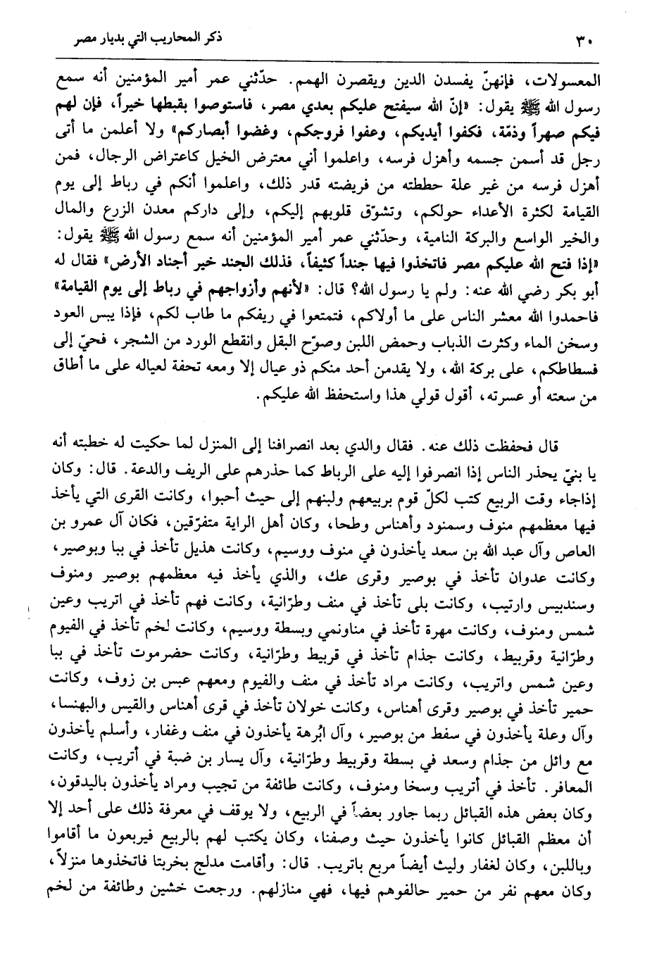 «إذا فتح الله عليكم مصر فاتخذوا فيها جندا كثيفا، فذلك الجند خير أجناد الأرض» فقال له أبو بكر رضي الله عنه: ولم يا رسول الله؟ قال: «لأنهم وأزواجهم في رباط إلى يوم القيامة» فاحمدوا الله معشر الناس على ما أولاكم، فتمتعوا في ريفكم ما طاب لكم، فإذا يبس العود وسخن الماء وكثرت الذباب وحمض اللبن وصوّح البقل وانقطع الورد من الشجر، فحيّ إلى فسطاطكم، على بركة الله، ولا يقدمن أحد منكم ذو عيال إلا ومعه تحفة لعياله على ما أطاق من سعته أو عسرته، أقول قولي هذا واستحفظ الله عليكم.