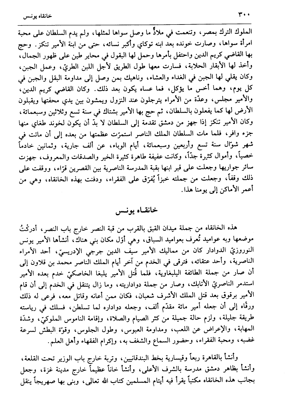 الملوك الترك بمصر، وتنعمت في ملاذّ ما وصل سواها لمثلها، ولم يدم السلطان على محبة امرأة سواها، وصارت خونده بعد ابنه توكاي وأكبر نسائه، حتى من ابنة الأمير تنكز. وحج بها القاضي كريم الدين واحتفل بأمرها وحمل لها البقول في محاير طين على ظهور الجمال، وأخذ لها الأبقار الحلابة، فسارت معها طول الطريق لأجل اللبن الطريّ، وعمل الجبن، وكان يقلي لها الجبن في الغداء والعشاء، وناهيك بمن وصل إلى مداومة البقل والجبن في كل يوم، وهما أخس ما يؤكل، فما عساه يكون بعد ذلك. وكان القاضي كريم الدين، والأمير مجلس، وعدّة من الأمراء يترجلون عند النزول ويمشون بين يدي محفتها ويقبلون الأرض لها كما يفعلون بالسلطان، ثم حج بها الأمير بشتاك في سنة تسع وثلاثين وسبعمائة، وكان الأمير تنكز إذا جهز من دمشق تقدمة إلى السلطان لا بدّ أن يكون لخوند طغاي منها جزء وافر، فلما مات السلطان الملك النصار استمرّت عظمتها من بعده إلى أن ماتت في شهر شوّال سنة تسع وأربعين وسبعمائة، أيام الوباء، عن ألف جارية، وثمانين خادما خصيا، وأموال كثيرة جدّا، وكانت عفيفة طاهرة كثيرة الخير والصدقات والمعروف، جهزت سائر جواريها وجعلت على قبر ابنها بقبة المدرسة الناصرية بين القصرين قرّاء، ووقفت على ذلك وقفا، وجعلت من جملته خبزا يفرّق على الفقراء، ودفنت بهذه الخانقاه، وهي من أعمر الأماكن إلى يومنا هذا.