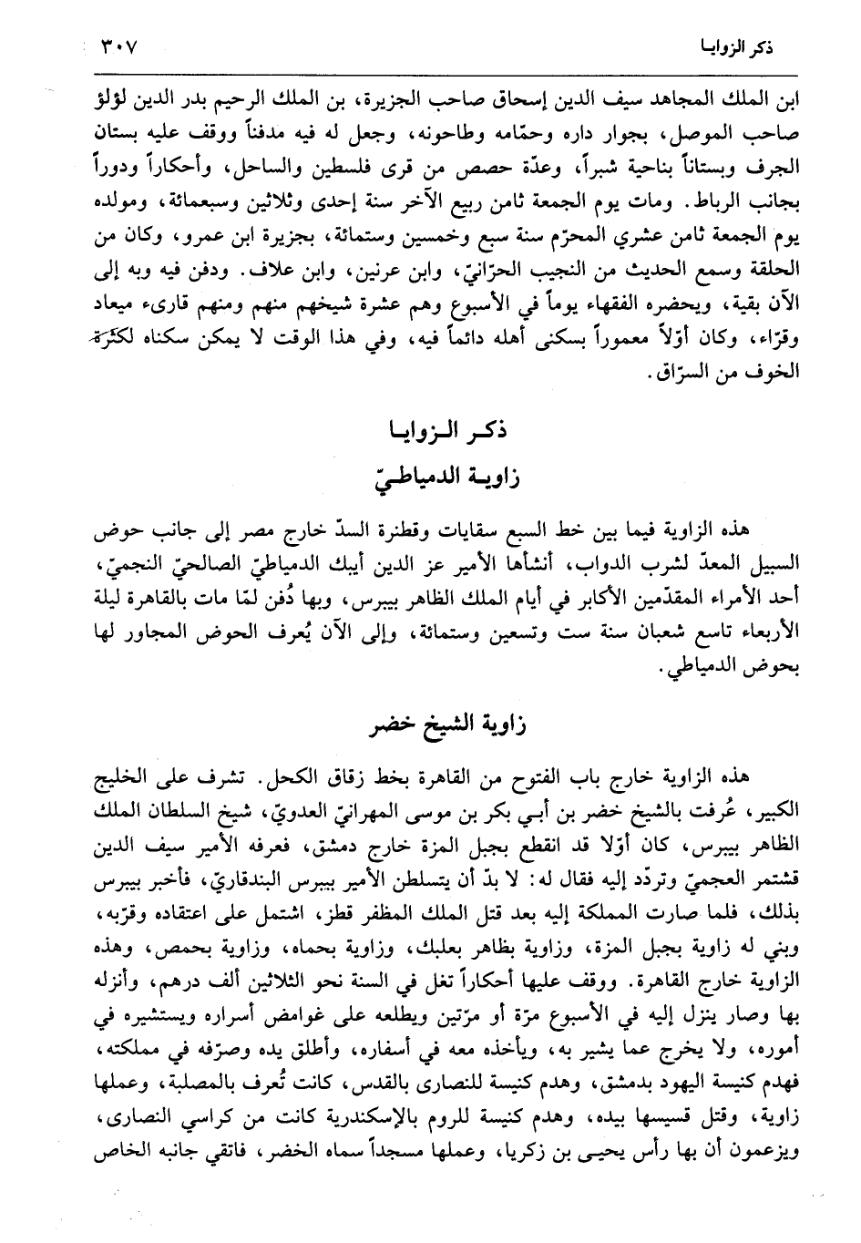 ابن الملك المجاهد سيف الدين إسحاق صاحب الجزيرة، بن الملك الرحيم بدر الدين لؤلؤ صاحب الموصل، بجوار داره وحمّامه وطاحونه، وجعل له فيه مدفنا ووقف عليه بستان الجرف وبستانا بناحية شبرا، وعدّة حصص من قرى فلسطين والساحل، وأحكارا ودورا بجانب الرباط. ومات يوم الجمعة ثامن ربيع الآخر سنة إحدى وثلاثين وسبعمائة، ومولده يوم الجمعة ثامن عشري المحرّم سنة سبع وخمسين وستمائة، بجزيرة ابن عمرو، وكان من الحلقة وسمع الحديث من النجيب الحرّانيّ، وابن عرنين، وابن علاف. ودفن فيه وبه إلى الآن بقية، ويحضره الفقهاء يوما في الأسبوع وهم عشرة شيخهم منهم ومنهم قارىء ميعاد وقرّاء، وكان أوّلا معمورا بسكنى أهله دائما فيه، وفي هذا الوقت لا يمكن سكناه لكثرة الخوف من السرّاق.