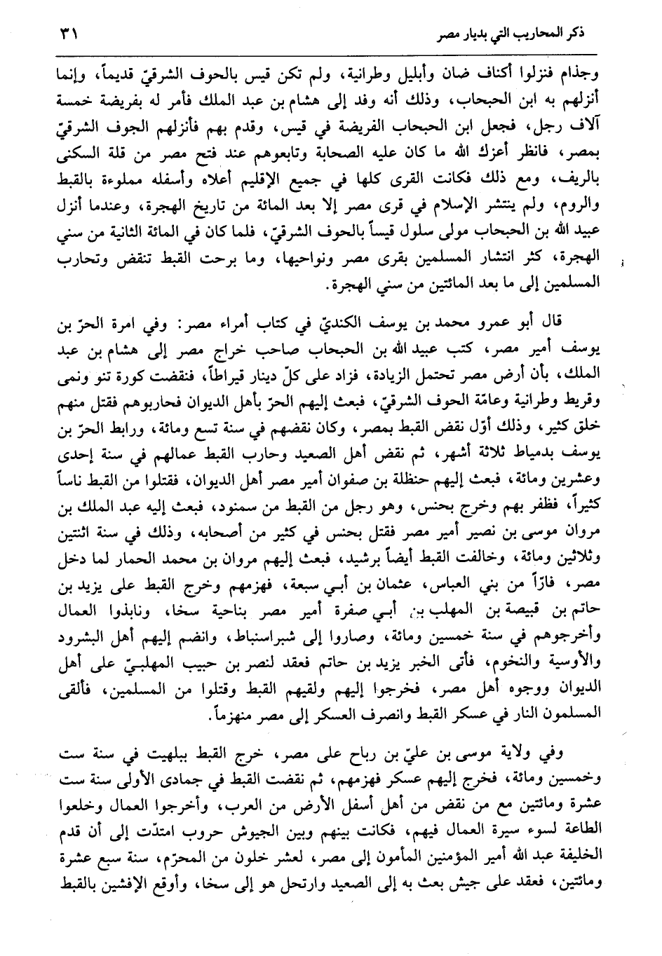 وجذام فنزلوا أكناف ضان وأبليل وطرانية، ولم تكن قيس بالحوف الشرقيّ قديما، وإنما أنزلهم به ابن الحبحاب، وذلك أنه وفد إلى هشام بن عبد الملك فأمر له بفريضة خمسة آلاف رجل، فجعل ابن الحبحاب الفريضة في قيس، وقدم بهم فأنزلهم الجوف الشرقيّ بمصر، فانظر أعزك الله ما كان عليه الصحابة وتابعوهم عند فتح مصر من قلة السكنى بالريف، ومع ذلك فكانت القرى كلها في جميع الإقليم أعلاه وأسفله مملوءة بالقبط والروم، ولم ينتشر الإسلام في قرى مصر إلا بعد المائة من تاريخ الهجرة، وعند ما أنزل عبيد الله بن الحبحاب مولى سلول قيسا بالحوف الشرقيّ، فلما كان في المائة الثانية من سني الهجرة، كثر انتشار المسلمين بقرى مصر ونواحيها، وما برحت القبط تنقض وتحارب المسلمين إلى ما بعد المائتين من سني الهجرة.