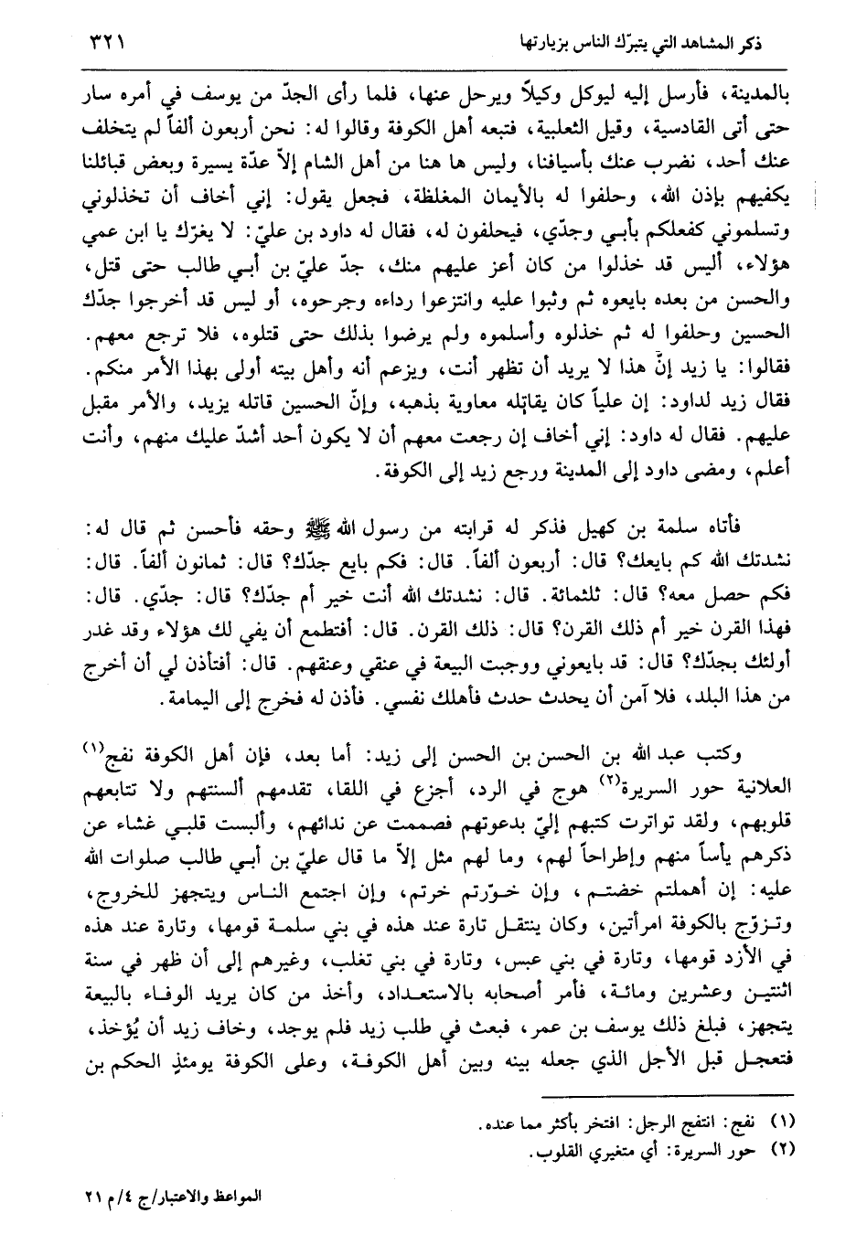 وكتب عبد الله بن الحسن بن الحسن إلى زيد: أما بعد، فإن أهل الكوفة نفج «1» العلانية حور السريرة «2» هوج في الرد، أجزع في اللقاء، تقدمهم ألسنتهم ولا تتابعهم قلوبهم، ولقد تواترت كتبهم إليّ بدعوتهم فصممت عن ندائهم، وألبست قلبي غشاء عن ذكرهم يأسا منهم وإطراحا لهم، وما لهم مثل إلّا ما قال عليّ بن أبي طالب صلوات الله عليه: إن أهملتم خضتم، وإن خوّرتم خرتم، وإن اجتمع الناس ويتجهز للخروج، وتزوّج بالكوفة امرأتين، وكان ينتقل تارة عند هذه في بني سلمة قومها، وتارة عند هذه في الأزد قومها، وتارة في بني عبس، وتارة في بني تغلب، وغيرهم إلى أن ظهر في سنة اثنتين وعشرين ومائة، فأمر أصحابه بالاستعداد، وأخذ من كان يريد الوفاء بالبيعة يتجهز، فبلغ ذلك يوسف بن عمر، فبعث في طلب زيد فلم يوجد، وخاف زيد أن يؤخذ، فتعجل قبل الأجل الذي جعله بينه وبين أهل الكوفة، وعلى الكوفة يومئذ الحكم بن