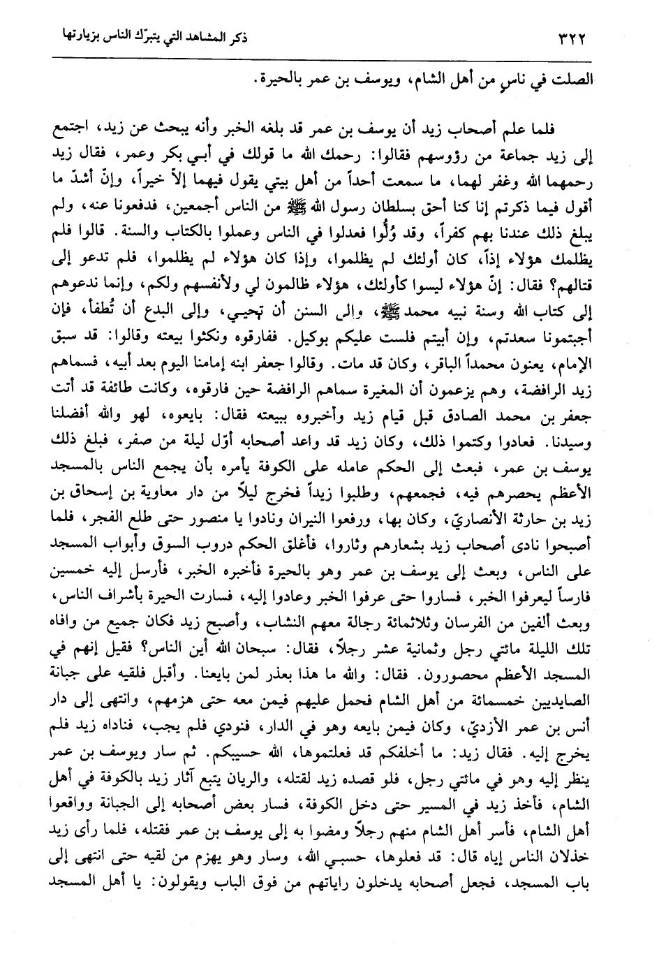 فلما علم أصحاب زيد أن يوسف بن عمر قد بلغه الخبر وأنه يبحث عن زيد، اجتمع إلى زيد جماعة من رؤوسهم فقالوا: رحمك الله ما قولك في أبي بكر وعمر، فقال زيد رحمهما الله وغفر لهما، ما سمعت أحدا من أهل بيتي يقول فيهما إلّا خيرا، وإنّ أشدّ ما أقول فيما ذكرتم إنا كنا أحق بسلطان رسول الله صلّى الله عليه وسلّم من الناس أجمعين، فدفعونا عنه، ولم يبلغ ذلك عندنا بهم كفرا، وقد ولّوا فعدلوا في الناس وعملوا بالكتاب والسنة. قالوا فلم يظلمك هؤلاء إذا، كان أولئك لم يظلموا، وإذا كان هؤلاء لم يظلموا، فلم تدعو إلى قتالهم؟ فقال: إنّ هؤلاء ليسوا كأولئك، هؤلاء ظالمون لي ولأنفسهم ولكم، وإنما ندعوهم إلى كتاب الله وسنة نبيه محمد صلّى الله عليه وسلّم، والى السنن أن تحيي، وإلى البدع أن تطفأ، فإن أجبتمونا سعدتم، وإن أبيتم فلست عليكم بوكيل. ففارقوه ونكثوا بيعته وقالوا: قد سبق الإمام، يعنون محمدا الباقر، وكان قد مات. وقالوا جعفر ابنه إمامنا اليوم بعد أبيه، فسماهم زيد الرافضة، وهم يزعمون أن المغيرة سماهم الرافضة حين فارقوه، وكانت طائفة قد أتت جعفر بن محمد الصادق قبل قيام زيد وأخبروه ببيعته فقال: بايعوه، لهو والله أفضلنا وسيدنا. فعادوا وكتموا ذلك، وكان زيد قد واعد أصحابه أوّل ليلة من صفر، فبلغ ذلك يوسف بن عمر، فبعث إلى الحكم عامله على الكوفة يأمره بأن يجمع الناس بالمسجد الأعظم يحصرهم فيه، فجمعهم، وطلبوا زيدا فخرج ليلا من دار معاوية بن إسحاق بن زيد بن حارثة الأنصاريّ، وكان بها، ورفعوا النيران ونادوا يا منصور حتى طلع الفجر، فلما أصبحوا نادى أصحاب زيد بشعارهم وثاروا، فأغلق الحكم دروب السوق وأبواب المسجد على الناس، وبعث إلى يوسف بن عمر وهو بالحيرة فأخبره الخبر، فأرسل إليه خمسين فارسا ليعرفوا الخبر، فساروا حتى عرفوا الخبر وعادوا إليه، فسارت الحيرة بأشراف الناس، وبعث ألفين من الفرسان وثلاثمائة رجالة معهم النشاب، وأصبح زيد فكان جميع من وافاه تلك الليلة مائتي رجل وثمانية عشر رجلا، فقال: سبحان الله أين الناس؟ فقيل إنهم في المسجد الأعظم محصورون. فقال: والله ما هذا بعذر لمن بايعنا. وأقبل فلقيه على جبانة الصايديين خمسمائة من أهل الشام فحمل عليهم فيمن معه حتى هزمهم، وانتهى إلى دار أنس بن عمر الأزديّ، وكان فيمن بايعه وهو في الدار، فنودي فلم يجب، فناداه زيد فلم يخرج إليه. فقال زيد: ما أخلفكم قد فعلتموها، الله حسيبكم. ثم سار ويوسف بن عمر ينظر إليه وهو في مائتي رجل، فلو قصده زيد لقتله، والريان يتبع آثار زيد بالكوفة في أهل الشام، فأخذ زيد في المسير حتى دخل الكوفة، فسار بعض أصحابه إلى الجبانة وواقعوا أهل الشام، فأسر أهل الشام منهم رجلا ومضوا به إلى يوسف بن عمر فقتله، فلما رأى زيد خذلان الناس إياه قال: قد فعلوها، حسبي الله، وسار وهو يهزم من لقيه حتى انتهى إلى باب المسجد، فجعل أصحابه يدخلون راياتهم من فوق الباب ويقولون: يا أهل المسجد