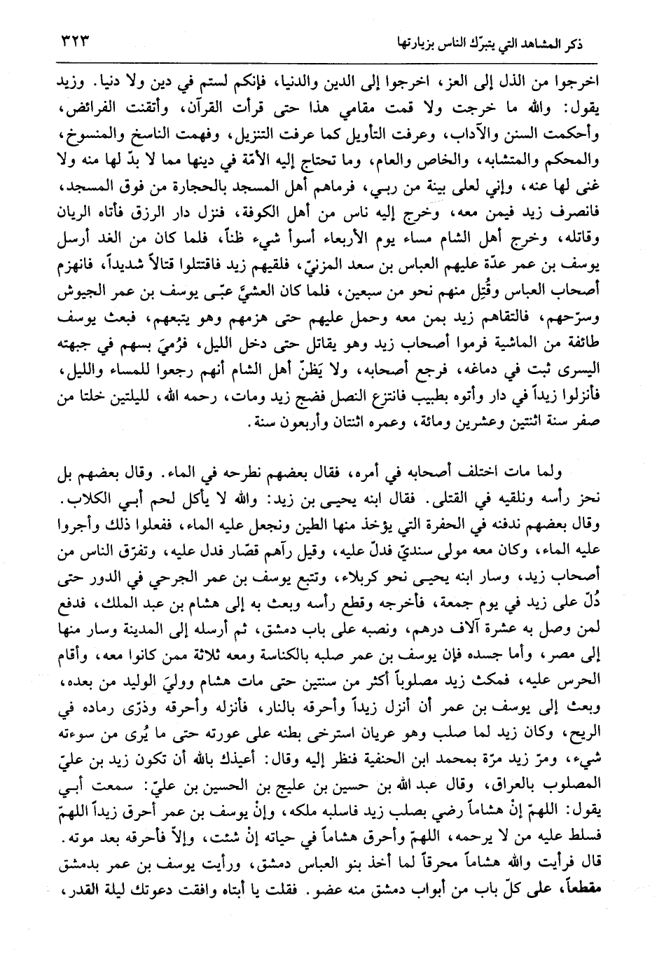 اخرجوا من الذل إلى العز، اخرجوا إلى الدين والدنيا، فإنكم لستم في دين ولا دنيا. وزيد يقول: والله ما خرجت ولا قمت مقامي هذا حتى قرأت القرآن، وأتقنت الفرائض، وأحكمت السنن والآداب، وعرفت التأويل كما عرفت التنزيل، وفهمت الناسخ والمنسوخ، والمحكم والمتشابه، والخاص والعام، وما تحتاج إليه الأمّة في دينها مما لا بدّ لها منه ولا غنى لها عنه، وإني لعلى بينة من ربي، فرماهم أهل المسجد بالحجارة من فوق المسجد، فانصرف زيد فيمن معه، وخرج إليه ناس من أهل الكوفة، فنزل دار الرزق فأتاه الريان وقاتله، وخرج أهل الشام مساء يوم الأربعاء أسوأ شيء ظنا، فلما كان من الغد أرسل يوسف بن عمر عدّة عليهم العباس بن سعد المزنيّ، فلقيهم زيد فاقتتلوا قتالا شديدا، فانهزم أصحاب العباس وقتل منهم نحو من سبعين، فلما كان العشيّ عبّى يوسف بن عمر الجيوش وسرّحهم، فالتقاهم زيد بمن معه وحمل عليهم حتى هزمهم وهو يتبعهم، فبعث يوسف طائفة من الماشية فرموا أصحاب زيد وهو يقاتل حتى دخل الليل، فرمي بسهم في جبهته اليسرى ثبت في دماغه، فرجع أصحابه، ولا يظنّ أهل الشام أنهم رجعوا للمساء والليل، فأنزلوا زيدا في دار وأتوه بطبيب فانتزع النصل فضج زيد ومات، رحمه الله، لليلتين خلتا من صفر سنة اثنتين وعشرين ومائة، وعمره اثنتان وأربعون سنة.