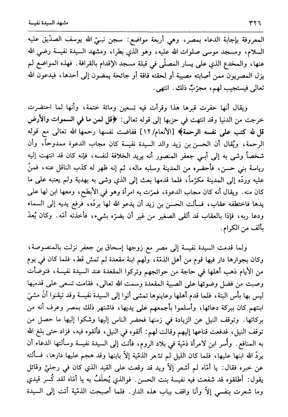 [الأنعام/ 12] ففاضت نفسها رحمها الله تعالى مع قوله الرحمة، ويقال أن الحسن بن زيد والد السيدة نفيسة كان مجاب الدعوة ممدوحا، وأن شخصا وشى به إلى أبي جعفر المنصور أنه يريد الخلافة لنفسه، فإنه كان قد انتهت إليه رياسة بني حسن، فأحضره من المدينة وسلبه ماله، ثم إنه ظهر له كذب الناقل عنه، فمنّ عليه وردّه إلى المدينة مكرّما، فلما قدمها بعث إلى الذي وشى به بهدية ولم يعتبه على ما كان منه. ويقال أنه كان مجاب الدعوة، فمرّت به امرأة وهو في الأبطح، ومعها ابن لها على يدها فاختطفه عقاب، فسألت الحسن بن زيد أن يدعو الله لها بردّه، فرفع يديه إلى السماء ودعا ربه، فإذا بالعقاب قد ألقى الصغير من غير أن يضرّه بشيء، فأخذته أمّه. وكان يعدّ بألف من الكرام.