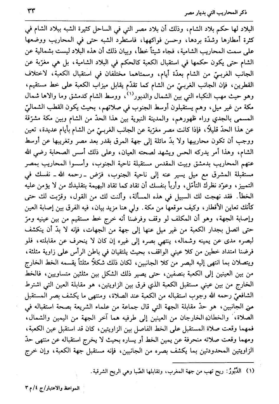 البلاد لها حكم بلاد الشام، وذلك أن بلاد مصر التي في الساحل كثيرة الشبه ببلاد الشام في كثرة أمطارها وشدّة بردها، وحسن فواكهها، فاستطرد الشبه حتى في المحاريب ووضعها على سمت المحاريب الشامية، فجاء شيئا خطأ، وبيان ذلك أن هذه البلاد ليست بشمالية عن الشام حتى يكون حكمها في استقبال الكعبة كالحكم في البلاد الشامية، بل هي مغرّبة عن الجانب الغربيّ من الشام بعدّة أيام، وسمتاهما مختلفان في استقبال الكعبة، لاختلاف القطرين، فإن الجانب الغربيّ من الشام كما تقدّم يقابل ميزاب الكعبة على خط مستقيم، وهو حيث مهب النكباء التي بين الشمال والدبور «1» ، ووسط الشام كدمشق وما والاها شمال مكة من غير ميل، وهم يستقبلون أوسط الجنوب في صلاتهم، بحيث يكون القطب الشماليّ المسمى بالجدي وراء ظهورهم، والمدينة النبوية بين هذا الحدّ من الشام وبين مكة مشرّقة عن هذا الحدّ قليلا، فإذا كانت مصر مغرّبة عن الجانب الغربيّ من الشام بأيام عديدة، تعين ووجب أن تكون محاريبها ولا بدّ مائلة إلى جهة المرق بقدر بعد مصر وتغريبها عن أوسط الشام، وهذا أمر يدركه الحس ويشهد لصحته العيان، وعلى ذلك أسس الصحابة رضي الله عنهم المحاريب بدمشق وبيت المقدس مستقبلة ناحية الجنوب، وأسسوا المحاريب بمصر مستقبلة المشرق مع ميل يسير عنه إلى ناحية الجنوب، فرض- رحمه الله- نفسك في التمييز، وعوّد نظرك التأمّل، وأربأ بنفسك أن تقاد كما تقاد البهيمة بتقليدك من لا يؤمن عليه الخطأ. فقد نهجت لك السبيل في هذه المسألة، وألنت لك من القول، وقرّبت لك حتى كأنك تعاين الأقطار، وكيف موقعها من مكة. ولي هنا مزيد بيان، فيه الفرق بين إصابة العين وإصابة الجهة، وهو أن المكلف لو وقف وفرضنا أنه خرج خط مستقيم من بين عينيه ومرّ حتى اتصل بجدار الكعبة من غير ميل عنها إلى جهة من الجهات، فإنه لا بدّ أن ينكشف لبصره مدى عن يمينه وشماله، ينتهي بصره إلى غيره إن كان لا ينحرف عن مقابلته، فلو فرضنا امتداد خطين من كلا عيني الواقف، بحيث يلتقيان في باطن الرأس على زاوية مثلثة، ويتصلان بما انتهى إليه البصر من كلا الجانبين، لكان ذلك شكلا مثلثا يقسمه الخط الخارج من بين العينين إلى الكعبة بنصفين، حتى يصير ذلك الشكل بين مثلثين متساويين، فالخط الخارج من بين عيني مستقبل الكعبة الذي فرق بين الزاويتين، هو مقابلة العين التي اشترط الشافعيّ رحمه الله وجوب استقباله من الكعبة عند الصلاة، ومنتهى ما يكشف بصر المستقبل من الجانبين، هو حدّ مقابلة الجهة التي قال جماعة من علماء الشريعة بصحة استقباله في الصلاة، والخطان الخارجان من العينين إلى طرفيه هما آخر الجهة من اليمين والشمال، فمهما وقعت صلاة المستقبل على الخط الفاصل بين الزاويتين، كان قد استقبل عين الكعبة، ومهما وقعت صلاته منحرفة عن يمين الخط أو يساره بحيث لا يخرج استقباله عن منتهى حدّ الزاويتين المحدودتين بما يكشف بصره من الجانبين، فإنه مستقبل جهة الكعبة، وإن خرج
