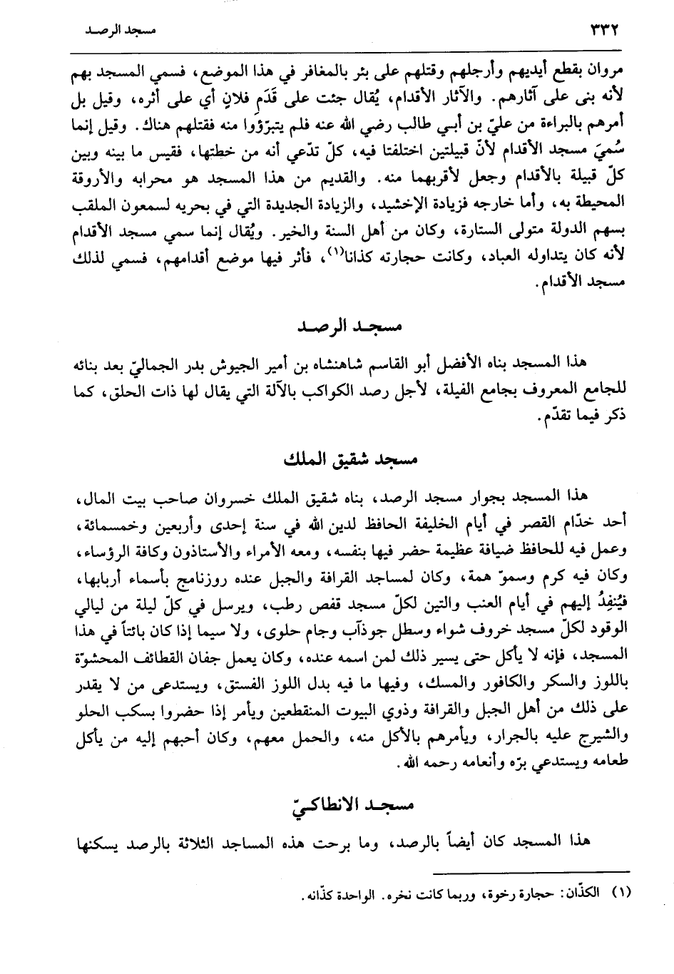 مروان بقطع أيديهم وأرجلهم وقتلهم على بئر المغافر في هذا الموضع، فسمي المسجد بهم لأنه بنى على آثارهم. والآثار الأقدام، يقال جئت على قدم فلان أي على أثره، وقيل بل أمرهم بالبراءة من عليّ بن أبي طالب رضي الله عنه فلم يتبرّؤوا منه فقتلهم هناك. وقيل إنما سمي مسجد الأقدام لأنّ قبيلتين اختلفتا فيه، كلّ تدّعي أنه من خطتها، فقيس ما بينه وبين كلّ قبيلة بالأقدام وجعل لأقربهما منه. والقديم من هذا المسجد هو محرابه والأروقة المحيطة به، وأما خارجه فزيادة الإخشيد، والزيادة الجديدة التي في بحريه لسمعون الملقب بسهم الدولة متولى الستارة، وكان من أهل السنة والخير. ويقال إنما سمي مسجد الأقدام لأنه كان يتداوله العباد، وكانت حجارته كذانا «1» ، فأثر فيها موضع أقدامهم، فسمي لذلك مسجد الأقدام.