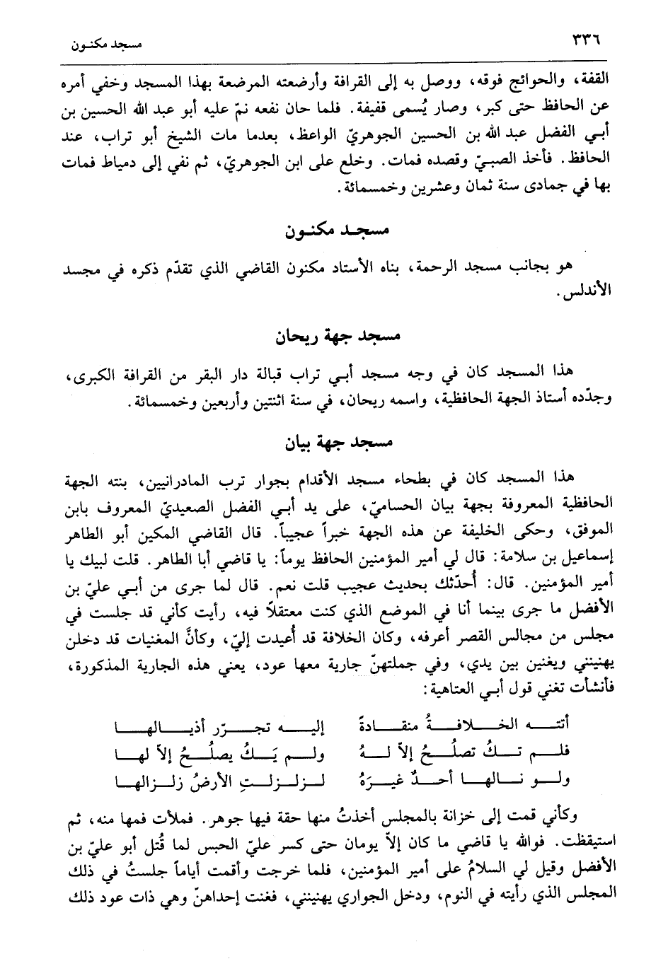هذا المسجد كان في بطحاء مسجد الأقدام بجوار ترب المادرانيين، بنته الجهة الحافظية المعروفة بجهة بيان الحساميّ، على يد أبي الفضل الصعيديّ المعروف بابن الموفق، وحكى الخليفة عن هذه الجهة خبرا عجيبا. قال القاضي المكين أبو الطاهر إسماعيل بن سلامة: قال لي أمير المؤمنين الحافظ يوما: يا قاضي أبا الطاهر. قلت لبيك يا أمير المؤمنين. قال: أحدّثك بحديث عجيب قلت نعم. قال لما جرى من أبي عليّ بن الأفضل ما جرى بينما أنا في الموضع الذي كنت معتقلا فيه، رأيت كأني قد جلست في مجلس من مجالس القصر أعرفه، وكان الخلافة قد أعيدت إليّ، وكأنّ المغنيات قد دخلن يهنينني ويغنين بين يدي، وفي جملتهنّ جارية معها عود، يعني هذه الجارية المذكورة، فأنشأت تغني قول أبي العتاهية: