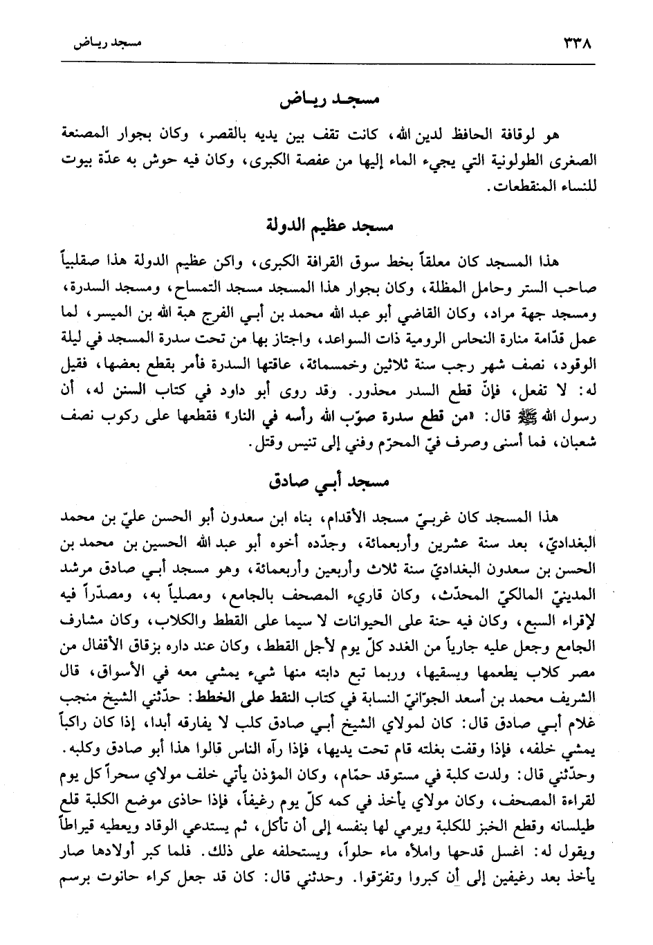 هذا المسجد كان غربيّ مسجد الأقدام، بناه ابن سعدون أبو الحسن عليّ بن محمد البغداديّ، بعد سنة عشرين وأربعمائة، وجدّده أخوه أبو عبد الله الحسين بن محمد بن الحسن بن سعدون البغداديّ سنة ثلاث وأربعين وأربعمائة، وهو مسجد أبي صادق مرشد المدينيّ المالكيّ المحدّث، وكان قاريء المصحف بالجامع، ومصليا به، ومصدّرا فيه لإقراء السبع، وكان فيه حنة على الحيوانات لا سيما على القطط والكلاب، وكان مشارف الجامع وجعل عليه جاريا من الغدد كلّ يوم لأجل القطط، وكان عند داره بزقاق الأقفال من مصر كلاب يطعمها ويسقيها، وربما تبع دابته منها شيء يمشي معه في الأسواق، قال الشريف محمد بن أسعد الجوّانيّ النسابة في كتاب النقط على الخطط: حدّثني الشيخ منجب غلام أبي صادق قال: كان لمولاي الشيخ أبي صادق كلب لا يفارقه أبدا، إذا كان راكبا يمشي خلفه، فإذا وقفت بغلته قام تحت يديها، فإذا رآه الناس قالوا هذا أبو صادق وكلبه.