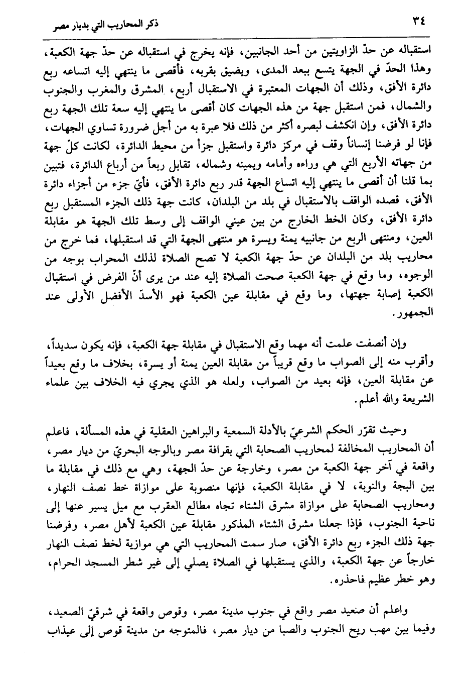 وحيث تقرّر الحكم الشرعيّ بالأدلة السمعية والبراهين العقلية في هذه المسألة، فاعلم أن المحاريب المخالفة لمحاريب الصحابة التي بقرافة مصر وبالوجه البحريّ من ديار مصر، واقعة في آخر جهة الكعبة من مصر، وخارجة عن حدّ الجهة، وهي مع ذلك في مقابلة ما بين البجة والنوبة، لا في مقابلة الكعبة، فإنها منصوبة على موازاة خط نصف النهار، ومحاريب الصحابة على موازاة مشرق الشتاء تجاه مطالع العقرب مع ميل يسير عنها إلى ناحية الجنوب، فإذا جعلنا مشرق الشتاء المذكور مقابلة عين الكعبة لأهل مصر، وفرضنا جهة ذلك الجزء ربع دائرة الأفق، صار سمت المحاريب التي هي موازية لخط نصف النهار خارجا عن جهة الكعبة، والذي يستقبلها في الصلاة يصلي إلى غير شطر المسجد الحرام، وهو خطر عظيم فاحذره.