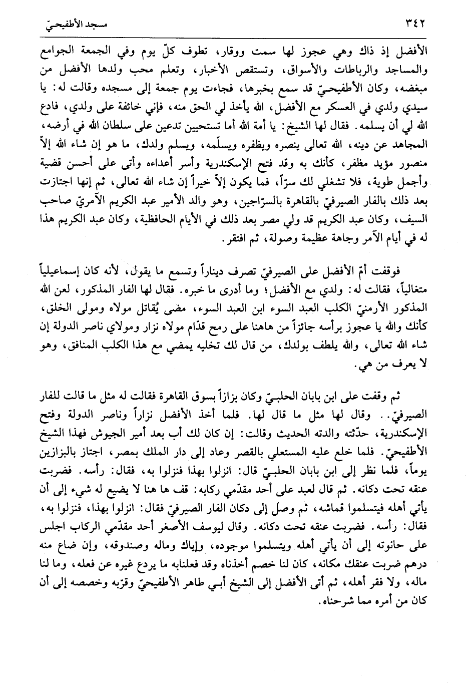 ثم وقفت على ابن بابان الحلبيّ وكان بزازا بسوق القاهرة فقالت له مثل ما قالت للفار الصيرفيّ ... وقال لها مثل ما قال لها. فلما أخذ الأفضل نزارا وناصر الدولة وفتح الإسكندرية، حدّثته والدته الحديث وقالت: إن كان لك أب بعد أمير الجيوش فهذا الشيخ الأطفيحيّ. فلما خلع عليه المستعلي بالقصر وعاد إلى دار الملك بمصر، اجتاز بالبزازين يوما، فلما نظر إلى ابن بابان الحلبيّ قال: انزلوا بهذا فنزلوا به، فقال: رأسه. فضربت عنقه تحت دكانه. ثم قال لعبد على أحد مقدّمي ركابه: قف هاهنا لا يضيع له شيء إلى أن يأتي أهله فيتسلموا قماشه، ثم وصل إلى دكان الفار الصيرفيّ فقال: انزلوا بهذا، فنزلوا به، فقال: رأسه. فضربت عنقه تحت دكانه. وقال ليوسف الأصغر أحد مقدّمي الركاب اجلس على حانوته إلى أن يأتي أهله ويتسلموا موجوده، وإياك وماله وصندوقه، وإن ضاع منه درهم ضربت عنقك مكانه، كان لنا خصم أخذناه وقد فعلنا به ما يردع غيره عن فعله، وما لنا ماله، ولا فقر أهله، ثم أتى الأفضل إلى الشيخ أبي طاهر الأطفيحيّ وقرّبه وخصصه إلى أن كان من أمره مما شرحناه.