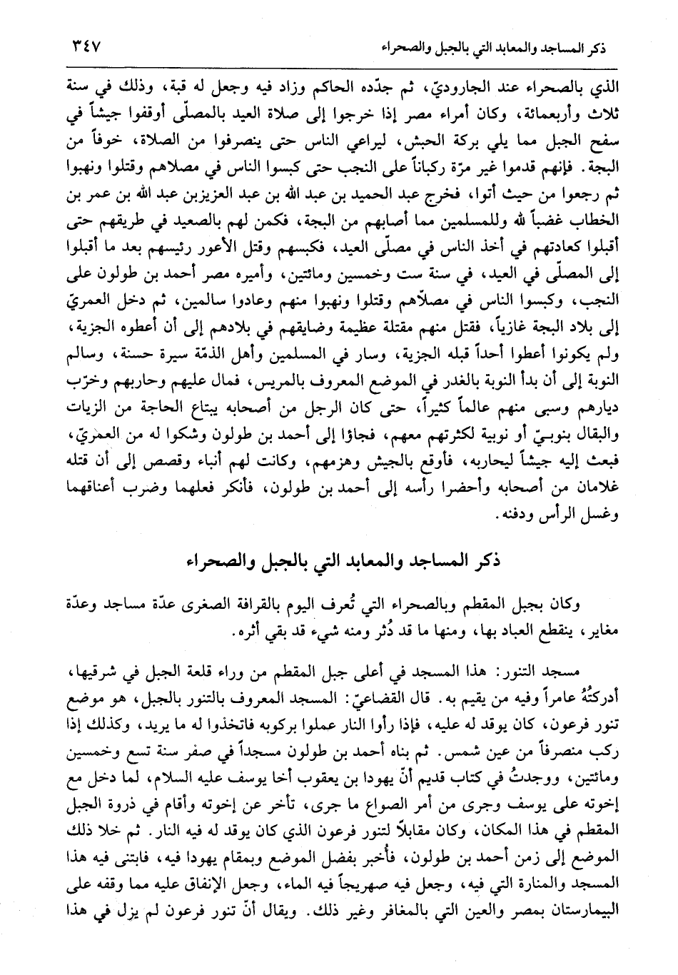 الذي بالصحراء عند الجاروديّ، ثم جدّده الحاكم وزاد فيه وجعل له قبة، وذلك في سنة ثلاث وأربعمائة، وكان أمراء مصر إذا خرجوا إلى صلاة العيد بالمصلّى أوقفوا جيشا في سفح الجبل مما يلي بركة الحبش، ليراعي الناس حتى ينصرفوا من الصلاة، خوفا من البجة. فإنهم قدموا غير مرّة ركبانا على النجب حتى كبسوا الناس في مصلاهم وقتلوا ونهبوا ثم رجعوا من حيث أتوا، فخرج عبد الحميد بن عبد الله بن عبد العزيز بن عبد الله بن عمر بن الخطاب غضبا لله وللمسلمين مما أصابهم من البجة، فكمن لهم بالصعيد في طريقهم حتى أقبلوا كعادتهم في أخذ الناس في مصلّى العيد، فكبسهم وقتل الأعور رئيسهم بعد ما أقبلوا إلى المصلّى في العيد، في سنة ست وخمسين ومائتين، وأميره مصر أحمد بن طولون على النجب، وكبسوا الناس في مصلّاهم وقتلوا ونهبوا منهم وعادوا سالمين، ثم دخل العمريّ إلى بلاد البجة غازيا، فقتل منهم مقتلة عظيمة وضايقهم في بلادهم إلى أن أعطوه الجزية، ولم يكونوا أعطوا أحدا قبله الجزية، وسار في المسلمين وأهل الذمّة سيرة حسنة، وسالم النوبة إلى أن بدأ النوبة بالغدر في الموضع المعروف بالمريس، فمال عليهم وحاربهم وخرّب ديارهم وسبى منهم عالما كثيرا، حتى كان الرجل من أصحابه يبتاع الحاجة من الزيات والبقال بنوبيّ أو نوبية لكثرتهم معهم، فجاؤا إلى أحمد بن طولون وشكوا له من العمريّ، فبعث إليه جيشا ليحاربه، فأوقع بالجيش وهزمهم، وكانت لهم أنباء وقصص إلى أن قتله غلامان من أصحابه وأحضرا رأسه إلى أحمد بن طولون، فأنكر فعلهما وضرب أعناقهما وغسل الرأس ودفنه.