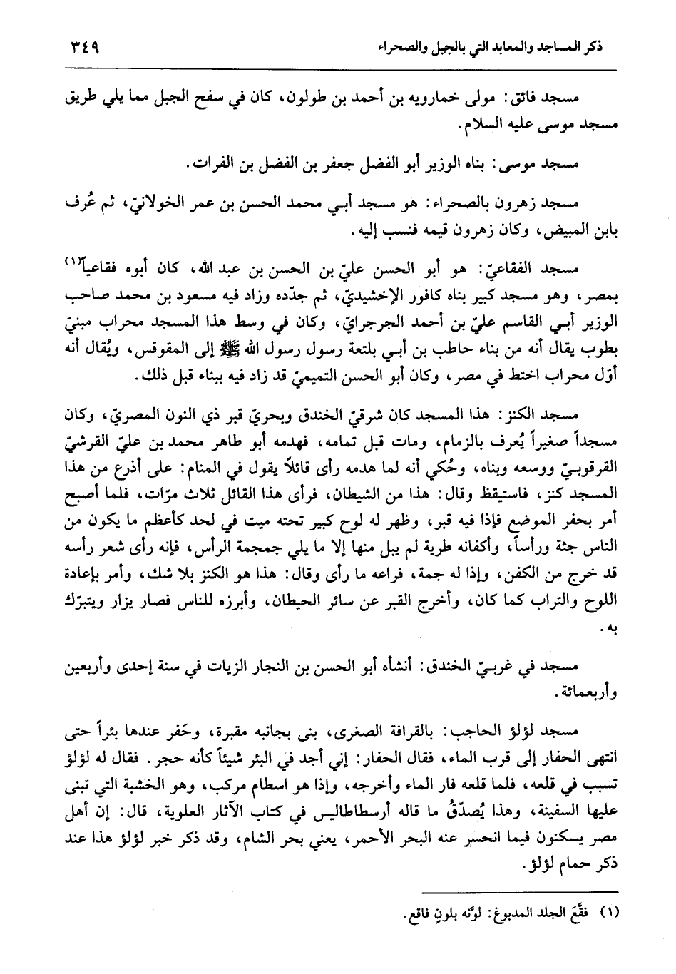 مسجد فائق: مولى خمارويه بن أحمد بن طولون، كان في سفح الجبل مما يلي طريق مسجد موسى عليه السلام.