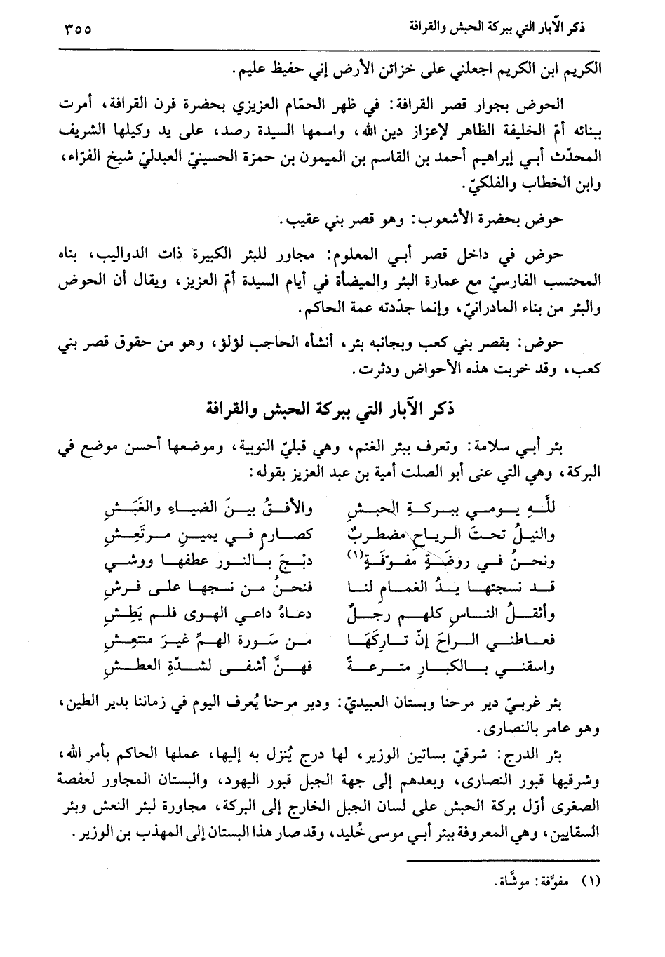 الحوض بجوار قصر القرافة: في ظهر الحمّام العزيزي بحضرة فرن القرافة، أمرت ببنائه أمّ الخليفة الظاهر لإعزاز دين الله، واسمها السيدة رصد، على يد وكيلها الشريف المحدّث أبي إبراهيم أحمد بن القاسم بن الميمون بن حمزة الحسينيّ العبدليّ شيخ الفرّاء، وابن الخطاب والفلكيّ.