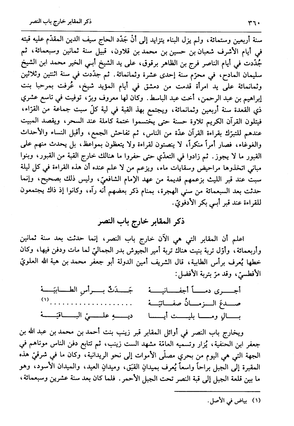 ويخارج باب النصر في أوائل المقابر قبر زينب بنت أحمد بن محمد بن عبد الله بن جعفر ابن الحنفية، يزار وتسميه العامّة مشهد الست زينب، ثم تتابع دفن الناس موتاهم في الجهة التي هي اليوم من بحري مصلّى الأموات إلى نحو الريدانية، وكان ما في شرقيّ هذه المقبرة إلى الجبل براحا واسعا يعرف بميدان القبق، وميدان العيد، والميدان الأسود، وهو ما بين قلعة الجبل إلى قبة النصر تحت الجبل الأحمر. فلما كان بعد سنة عشرين وسبعمائة،
