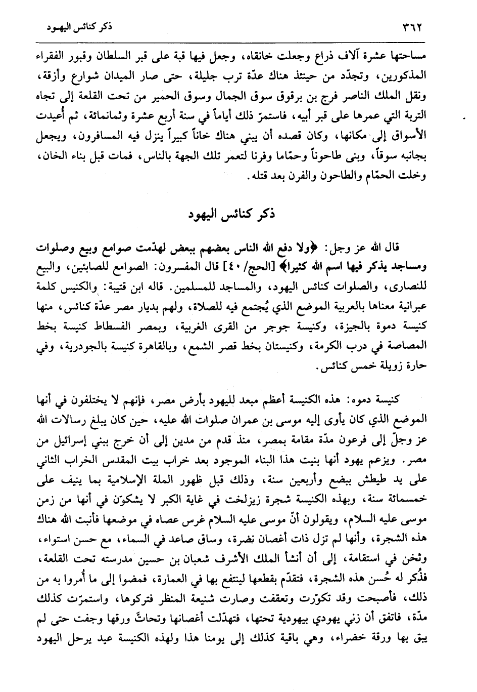 [الحج/ 40] قال المفسرون: الصوامع للصابئين، والبيع للنصارى، والصلوات كنائس اليهود، والمساجد للمسلمين. قاله ابن قتيبة: والكنيس كلمة عبرانية معناها بالعربية الموضع الذي يجتمع فيه للصلاة، ولهم بديار مصر عدة كنائس، منها كنيسة دموة بالجيزة، وكنيسة جوجر من القرى الغربية، وبمصر الفسطاط كنيسة بخط المصاصة في درب الكرمة، وكنيستان بخط قصر الشمع، وبالقاهرة كنيسة بالجودرية، وفي حارة زويلة خمس كنائس.