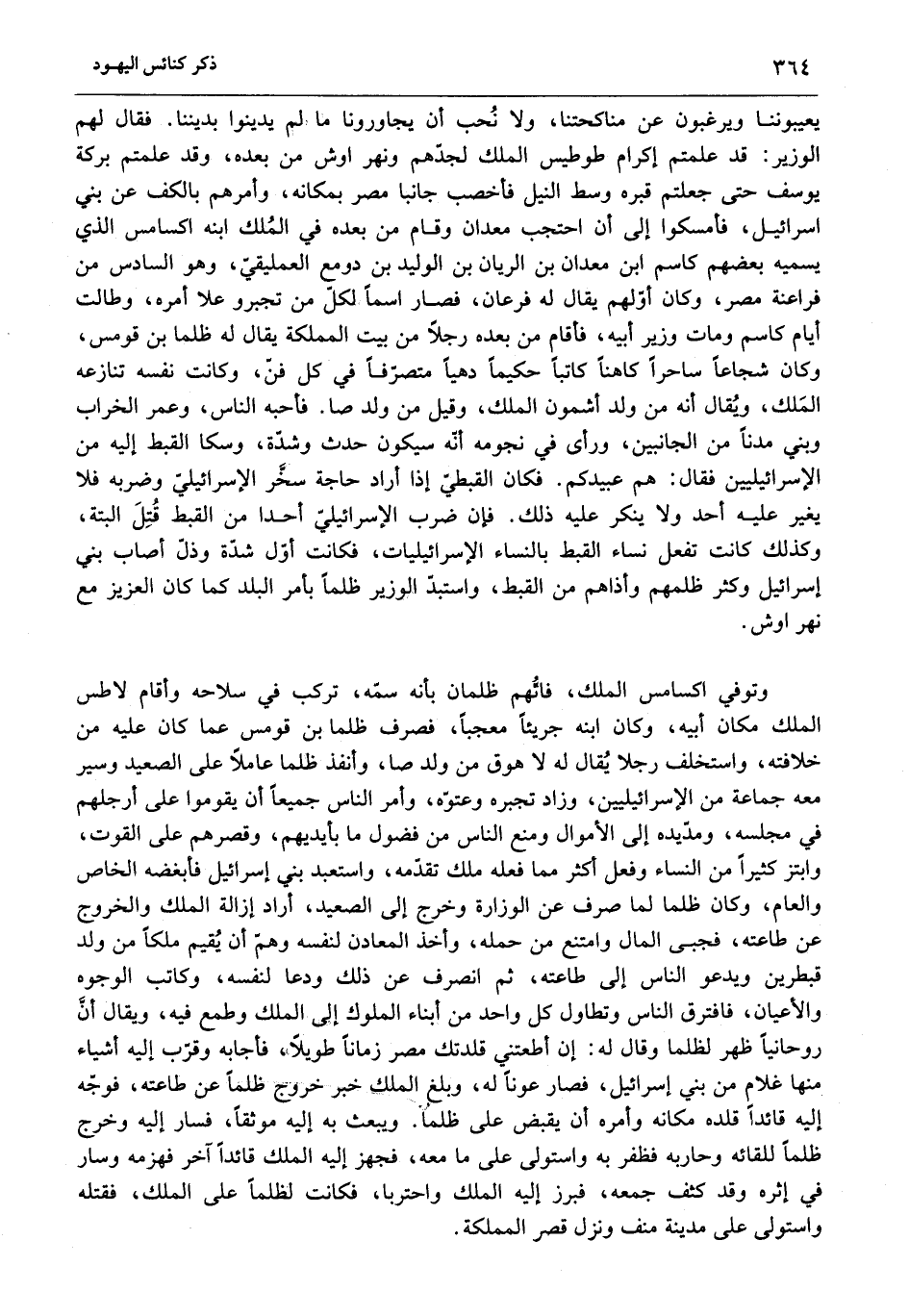 يعيبوننا ويرغبون عن مناكحتنا، ولا نحب أن يجاورونا ما لم يدينوا بديننا. فقال لهم الوزير: قد علمتم إكرام طوطيس الملك لجدّهم ونهر اوش من بعده، وقد علمتم بركة يوسف حتى جعلتم قبره وسط النيل فأخصب جانبا مصر بمكانه، وأمرهم بالكف عن بني إسرائيل، فأمسكوا إلى أن احتجب معدان وقام من بعده في الملك ابنه اكسامس الذي يسميه بعضهم كاسم ابن معدان بن الريان بن الوليد بن دومع العمليقيّ، وهو السادس من فراعنة مصر، وكان أوّلهم يقال له فرعان، فصار اسما لكلّ من تجبر وعلا أمره، وطالت أيام كاسم ومات وزير أبيه، فأقام من بعده رجلا من بيت المملكة يقال له ظلما بن قومس، وكان شجاعا ساحرا كاهنا كاتبا حكيما دهيا متصرّفا في كل فنّ، وكانت نفسه تنازعه الملك، ويقال أنه من ولد أشمون الملك، وقيل من ولد صا. فأحبه الناس، وعمر الخراب وبني مدنا من الجانبين، ورأى في نجومه أنّه سيكون حدث وشدّة، وسكا القبط إليه من الإسرائيليين فقال: هم عبيدكم. فكان القبطيّ إذا أراد حاجة سخّر الإسرائيليّ وضربه فلا يغير عليه أحد ولا ينكر عليه ذلك. فإن ضرب الإسرائيليّ أحدا من القبط قتل البتة، وكذلك كانت تفعل نساء القبط بالنساء الإسرائيليات، فكانت أوّل شدّة وذلّ أصاب بني إسرائيل وكثر ظلمهم وأذاهم من القبط، واستبدّ الوزير ظلما بأمر البلد كما كان العزيز مع نهراوش.