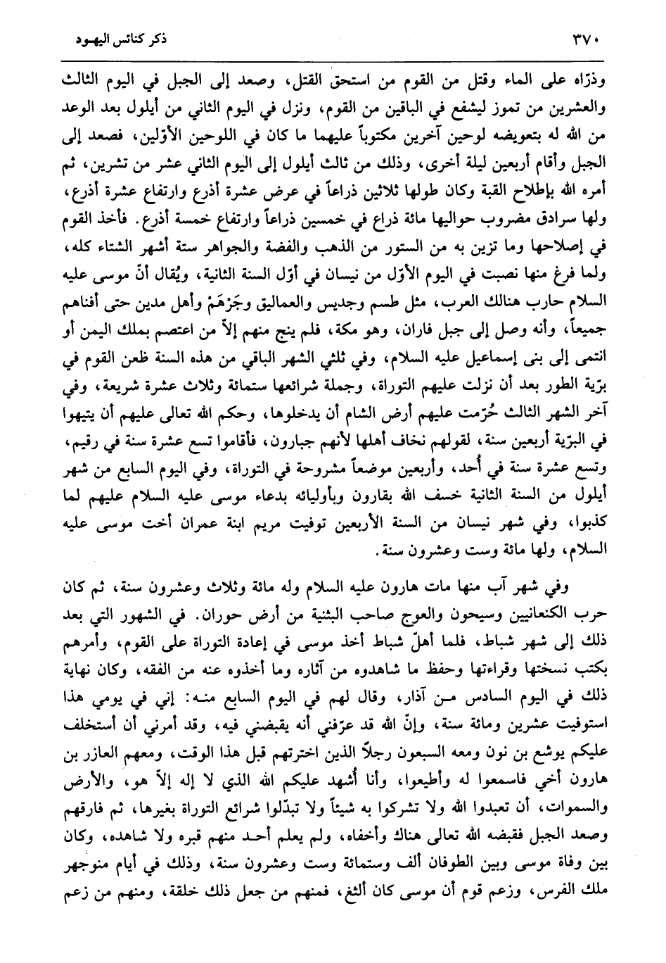 وفي شهر آب منها مات هارون عليه السلام وله مائة وثلاث وعشرون سنة، ثم كان حرب الكنعانيين وسيحون والعوج صاحب البثنية من أرض حوران. في الشهور التي بعد ذلك إلى شهر شباط، فلما أهلّ شباط أخذ موسى في إعادة التوراة على القوم، وأمرهم بكتب نسختها وقراءتها وحفظ ما شاهدوه من آثاره وما أخذوه عنه من الفقه، وكان نهاية ذلك في اليوم السادس من آذار، وقال لهم في اليوم السابع منه: إني في يومي هذا استوفيت عشرين ومائة سنة، وإنّ الله قد عرّفني أنه يقبضني فيه، وقد أمرني أن أستخلف عليكم يوشع بن نون ومعه السبعون رجلا الذين اخترتهم قبل هذا الوقت، ومعهم العازر بن هارون أخي فاسمعوا له وأطيعوا، وأنا أشهد عليكم الله الذي لا إله إلّا هو، والأرض والسماوات، أن تعبدوا الله ولا تشركوا به شيئا ولا تبدّلوا شرائع التوراة بغيرها، ثم فارقهم وصعد الجبل فقبضه الله تعالى هناك وأخفاه، ولم يعلم أحد منهم قبره ولا شاهده، وكان بين وفاة موسى وبين الطوفان ألف وستمائة وست وعشرون سنة، وذلك في أيام منوجهر ملك الفرس، وزعم قوم أن موسى كان ألثغ، فمنهم من جعل ذلك خلقة، ومنهم من زعم
