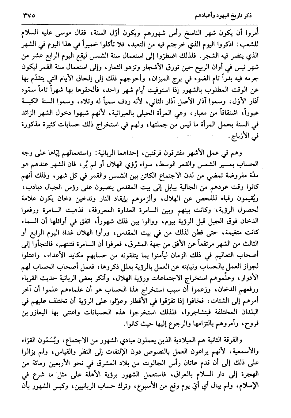 وهم في عمل الأشهر مفترقون فرقتين، إحداهما الربانية: واستعمالهم إيّاها على وجه الحساب بمسير الشمس والقمر الوسط، سواء رؤي الهلال أو لم ير، فان الشهر عندهم هو مدّة مفروضة تمضي من لدن الاجتماع الكائن بين الشمس والقمر في كل شهر، وذلك أنهم كانوا وقت عودهم من الجالية ببابل إلى بيت المقدس ينصبون على رؤس الجبال دبادب، ويقيمون رقباء للفحص عن الهلال، وألزموهم بإيقاد النار وتدخين دخان يكون علامة لحصول الرؤية، وكانت بينهم وبين السامرة العداوة المعروفة، فذهبت السامرة ورفعوا الدخان فوق الجبل قبل الرؤية بيوم، ووالوا بين ذلك شهورا، اتفق في أوائلها أن السماء كانت متغيمة، حتى فطن لذلك من في بيت المقدس، ورأوا الهلال غداة اليوم الرابع أو الثالث من الشهر مرتفعا عن الأفق من جهة المشرق، فعرفوا أن السامرة فتنتهم، فالتجأوا إلى أصحاب التعاليم في ذلك الزمان ليأمنوا بما يتلقونه من حسابهم مكايد الأعداء، واعتلوا لجواز العمل بالحساب ونيابته عن العمل بالرؤية بعلل ذكروها، فعمل أصحاب الحساب لهم الأدوار، وعلّموهم استخراج الاجتماعات ورؤية الهلال، وأنكر بعض الربانية حديث القرباء ورفعهم الدخان، وزعموا أن سبب استخراج هذا الحساب هو أن علماءهم علموا أن آخر أمرهم إلى الشتات، فخافوا إذا تفرّقوا في الأقطار وعوّلوا على الرؤية أن تختلف عليهم في البلدان المختلفة فيتشاجروا، فلذلك استخرجوا هذه الحسبانات واعتنى بها اليعازر بن فروح، وأمروهم بالتزامها والرجوع إليها حيث كانوا.