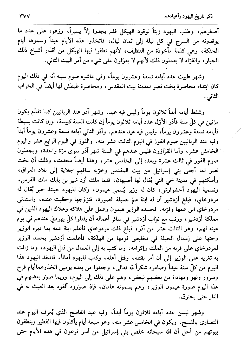 وشفط أيامه أبدا ثلاثون يوما وليس فيه عيد. وشهر آذر عند الربانيين كما تقدّم يكون مرّتين في كلّ سنة فآذر الأوّل عدد أيامه ثلاثون يوما إن كانت السنة كبيسة، وإن كانت بسيطة فأيامه تسعة وعشرون يوما، وليس فيه عيد عندهم. وآذر الثاني أيامه تسعة وعشرون يوما أبدا وفيه عند الربانيين صوم الفوز في اليوم الثالث عشر منه، والفوز في اليوم الرابع عشر واليوم الخامس عشر، وأما القرّاؤون فليس عندهم في السنة شهر آذر سوى مرّة واحدة، ويجعلون صوم الفور في ثالث عشرة وبعده إلى الخامس عشر، وهذا أيضا محدث، وذلك أن بخت نصر لما أجلى بني إسرائيل من بيت المقدس وخرّبه ساقهم جلاية إلى بلاد العراق، وأسكنهم في مدينة خي التي يقال لها أصبهان، فلما ملك أزد شير بن بابك ملك الفرس، وتسمية اليهود أحشوارش، كان له وزير يسمى هيمون، وكان لليهود حينئذ حبر يقال له مردوخاي، فبلغ أزدشير أن له ابنة عمّ جميلة الصورة، فتزوّجها وحظيت عنده، واستدنى مردوخاي ابن عمها وقرّبه، فحسده الوزير هيمون وعمل على هلاكه وهلاك اليهود الذين في مملكة أزدشير، ورتب مع نوّاب أزدشير في سائر أعماله أن يقتلوا كلّ يهوديّ عندهم في يوم عينه لهم، وهو الثالث عشر من آذر، فبلغ ذلك مردوخاي فأعلم ابنة عمه بما دبره الوزير وحثها على إعمال الحيلة في تخليص قومها من الهلكة، فأعلمت أزدشير بحسد الوزير لمردوخاي على قربه من الملك وإكرامه، وما كتب به إلى العمال من قتل اليهود، وما زالت به تغريه على الوزير إلى أن أمر بقتله، وقتل أهله، وكتب لليهود أمانا، فاتخذ اليهود هذا اليوم من كلّ سنة عيدا وصاموه شكرا لله تعالى، وجعلوا من بعده يومين اتخذوهما أيام فرح وسرور ولهو ومهاداة من بعضهم لبعض، وهم على ذلك إلى اليوم، وربما صوّر بعضهم في هذا اليوم صورة هيمون الوزير، وهم يسمونه هامان، فإذا صوّروه ألقوه بعد العبث به في النار حتى يحترق.