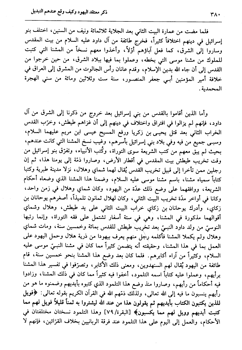 وأما الذين أقاموا بالقدس من بني إسرائيل بعد خروج من ذكرنا إلى الشرق من آل داود، فإنهم لم يزالوا في افتراق واختلاف في دينهم إلى أن غزاهم طيطش، وخرّب القدس الخراب الثاني بعد قتل يحيى بن زكريا ورفع المسيح عيسى بن مريم عليهما السلام، وسبى جميع من فيه وفي بلاد بني إسرائيل بأسرهم، وغيب نسخ المشنا التي كانت عندهم، بحيث لم يبق معهم من كتب الشريعة سوى التوراة، وكتب الأنبياء، وتفرّق بنو إسرائيل من وقت تخريب طيطش بيت المقدس في أقطار الأرض، وصاروا ذمّة إلى يومنا هذا، ثم إن رجلين ممن تأخروا إلى قبيل تخريب القدس يقال لهما شماي وهلال، نزلا مدينة طبرية وكتبا كتابا سمياه مشنا، باسم مشنا موسى عليه السلام، وضمنا هذا المشنا الذي وضعاه أحكام الشريعة، ووافقهما على وضع ذلك عدّة من اليهود، وكان شماي وهلال في زمن واحد، وكانا في أواخر مدّة تخريب البيت الثاني، وكان لهلال ثمانون تلميذا، أصغرهم يوحانان بن زكاي، وأدرك يوحانان بن زكاي خراب البيت الثاني على يد طيطش، وهلال وشماي أقوالهما مذكورة في المشنا، وهي في ستة أسفار تشتمل على فقه التوراة، وإنما رتبها النوسيّ من ولد داود النبيّ بعد تخريب طيطش للقدس بمائة وخمسين سنة، ومات شماي وهلال ولم يكملا المشنا فأكمله رجل منهم يعرف بيهودا من ذرية هلال وحمل اليهود على العمل بما في هذا المشنا، وحقيقته أنه يتضمن كثيرا مما كان في مشنا النبيّ موسى عليه السلام، وكثيرا من آراء أكابرهم. فلما كان بعد وضع هذا المشنا بنحو خمسين سنة، قام طائفة من اليهود يقال لهم السنهدوين، ومعنى ذلك الأكابر، وتصرّفوا في تفسير هذا المشنا برأيهم، وعملوا عليه كتابا اسمه التلمود، أخفوا فيه كثيرا مما كان في ذلك المشنا، وزادوا فيه أحكاما من رأيهم، وصاروا منذ وضع هذا التلمود الذي كتبوه بأيديهم وضمنوه ما هو من رأيهم ينسبون ما فيه إلى الله تعالى، ولذلك ذمّهم الله في القرآن الكريم بقوله تعالى: فَوَيْلٌ لِلَّذِينَ يَكْتُبُونَ الْكِتابَ بِأَيْدِيهِمْ ثُمَّ يَقُولُونَ هذا مِنْ عِنْدِ اللَّهِ لِيَشْتَرُوا بِهِ ثَمَناً قَلِيلًا فَوَيْلٌ لَهُمْ مِمَّا كَتَبَتْ أَيْدِيهِمْ وَوَيْلٌ لَهُمْ مِمَّا يَكْسِبُونَ