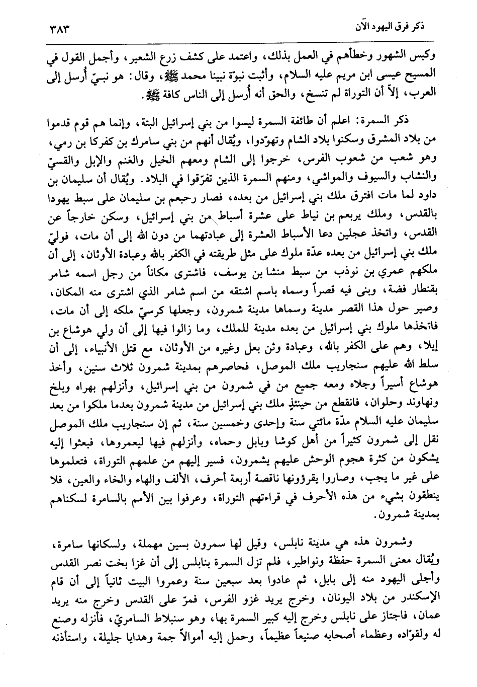ذكر السمرة: اعلم أن طائفة السمرة ليسوا من بني إسرائيل البتة، وإنما هم قوم قدموا من بلاد المشرق وسكنوا بلاد الشام وتهوّدوا، ويقال أنهم من بني سامرك بن كفركا بن رمي، وهو شعب من شعوب الفرس، خرجوا إلى الشام ومعهم الخيل والغنم والإبل والقسيّ والنشاب والسيوف والمواشي، ومنهم السمرة الذين تفرّقوا في البلاد. ويقال أن سليمان بن داود لما مات افترق ملك بني إسرائيل من بعده، فصار رحبعم بن سليمان على سبط يهودا بالقدس، وملك يربعم بن نياط على عشرة أسباط من بني إسرائيل، وسكن خارجا عن القدس، واتخذ عجلين دعا الأسباط العشرة إلى عبادتهما من دون الله إلى أن مات، فوليّ ملك بني إسرائيل من بعده عدّة ملوك على مثل طريقته في الكفر بالله وعبادة الأوثان، إلى أن ملكهم عمري بن نوذب من سبط منشا بن يوسف، فاشترى مكانا من رجل اسمه شامر بقنطار فضة، وبنى فيه قصرا وسماه باسم اشتقه من اسم شامر الذي اشترى منه المكان، وصير حول هذا القصر مدينة وسماها مدينة شمرون، وجعلها كرسيّ ملكه إلى أن مات، فاتخذها ملوك بني إسرائيل من بعده مدينة للملك، وما زالوا فيها إلى أن ولي هو شاع بن إيلا، وهم على الكفر بالله، وعبادة وثن بعل وغيره من الأوثان، مع قتل الأنبياء، إلى أن سلط الله عليهم سنجاريب ملك الموصل، فحاصرهم بمدينة شمرون ثلاث سنين، وأخذ هو شاع أسيرا وجلاه ومعه جميع من في شمرون من بني إسرائيل، وأنزلهم بهراه وبلخ ونهاوند وحلوان، فانقطع من حينئذ ملك بني إسرائيل من مدينة شمرون بعد ما ملكوا من بعد سليمان عليه السلام مدّة مائتي سنة وإحدى وخمسين سنة، ثم إن سنجاريب ملك الموصل نقل إلى شمرون كثيرا من أهل كوشا وبابل وحماه، وأنزلهم فيها ليعمروها، فبعثوا إليه يشكون من كثرة هجوم الوحش عليهم يشمرون، فسير إليهم من علمهم التوراة، فتعلموها على غير ما يجب، وصاروا يقرءونها ناقصة أربعة أحرف، الألف والهاء والخاء والعين، فلا ينطقون بشيء من هذه الأحرف في قراءتهم التوراة، وعرفوا بين الأمم بالسامرة لسكناهم بمدينة شمرون.