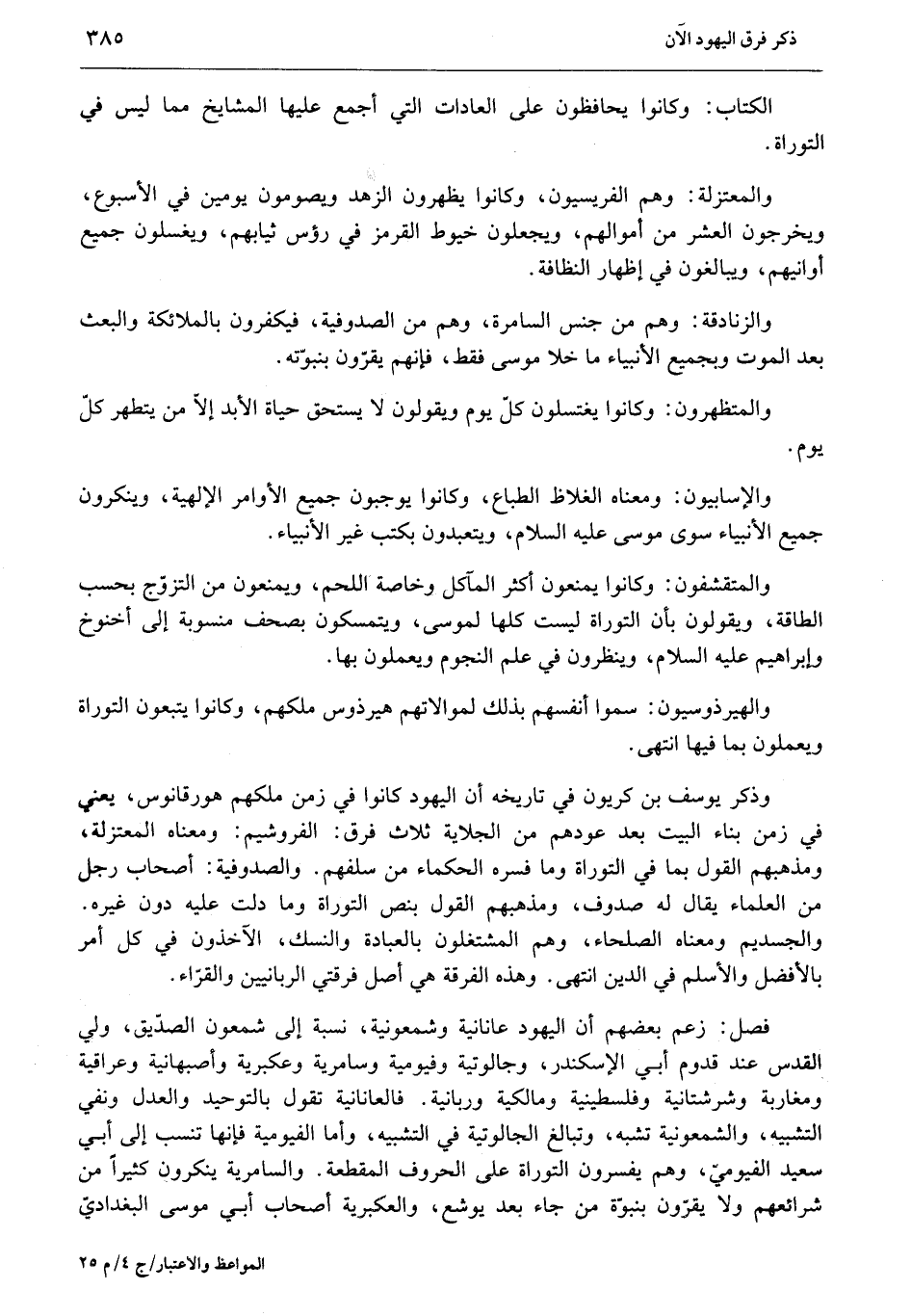 فصل: زعم بعضهم أن اليهود عانانية وشمعونية، نسبة إلى شمعون الصدّيق، ولي القدس عند قدوم أبي الإسكندر، وجالوتية وفيومية وسامرية وعكبرية وأصبهانية وعراقية ومغاربة وشرشتانية وفلسطينية ومالكية وربانية. فالعانانية تقول بالتوحيد والعدل ونفي التشبيه، والشمعونية تشبه، وتبالغ الجالوتية في التشبيه، وأما الفيومية فإنها تنسب إلى أبي سعيد الفيوميّ، وهم يفسرون التوراة على الحروف المقطعة. والسامرية ينكرون كثيرا من شرائعهم ولا يقرّون بنبوّة من جاء بعد يوشع، والعكبرية أصحاب أبي موسى البغداديّ