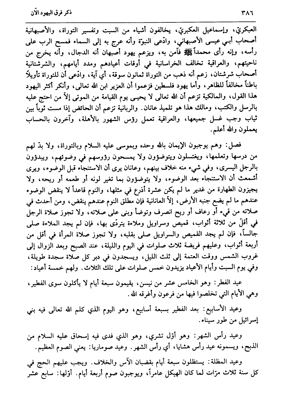 فصل: وهم يوجبون الإيمان بالله وحده وبموسى عليه السلام وبالتوراة، ولا بدّ لهم من درسها وتعلمها، ويغتسلون ويتوضؤون ولا يمسحون رؤوسهم في وضوئهم، ويبدؤون بالرجل اليسرى، وفي شيء منه خلاف بينهم، وعانان يرى أن الاستنجاء قبل الوضوء، ويرى أشمعث أن الاستنجاء بعد الوضوء، ولا يتوضؤون بما تغير لونه أو طعمه أو ريحه، ولا يجيزون الطهارة من غدير ما لم يكن عشرة أذرع في مثلها، والنوم قاعدا لا ينقض الوضوء عندهم ما لم يضع جنبه الأرض، إلّا العانانية فإن مطلق النوم عندهم ينقض، ومن أحدث في صلاته من قيء أو رعاف أو ريح انصرف وتوضأ وبنى على صلاته، ولا تجوز صلاة الرجل في أقلّ من ثلاثة أثواب، قميص وسراويل وملاءة يتردّى بها، فإن لم يجد الملاءة صلّى جالسا، فإن لم يجد القميص والسراويل صلّى بقلبه، ولا تجوز صلاة المرأة في أقل من أربعة أثواب، وعليهم فريضة ثلاث صلوات في اليوم والليلة، عند الصبح وبعد الزوال إلى غروب الشمس ووقت العتمة إلى ثلث الليل، ويسجدون في دبر كل صلاة سجدة طويلة، وفي يوم السبت وأيام الأعياد يزيدون خمس صلوات على تلك الثلاث. ولهم خمسة أعياد: