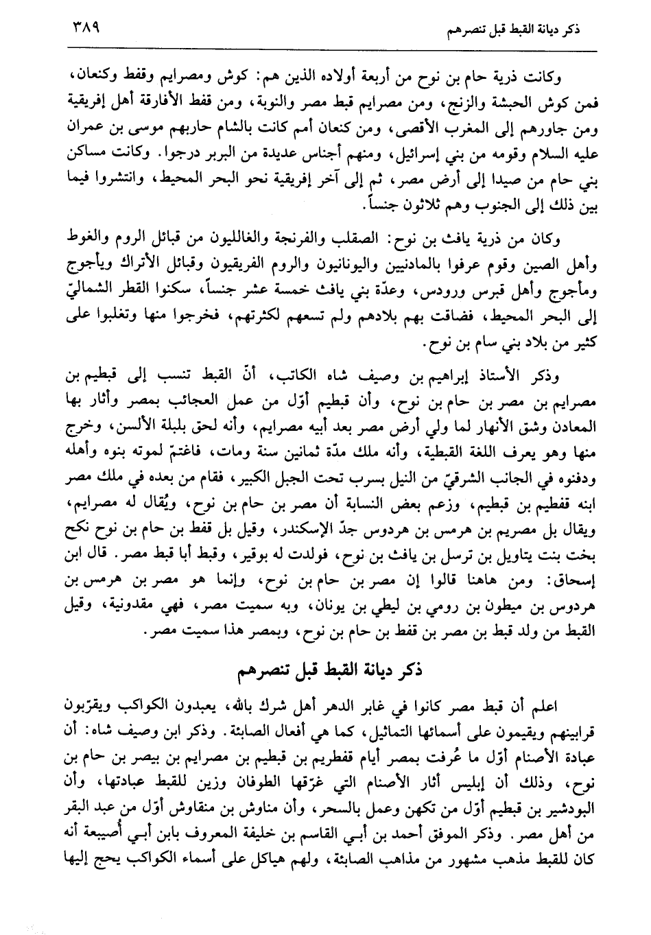 اعلم أن قبط مصر كانوا في غابر الدهر أهل شرك بالله، يعبدون الكواكب ويقرّبون قرابينهم ويقيمون على أسمائها التماثيل، كما هي أفعال الصابئة. وذكر ابن وصيف شاه: أن عبادة الأصنام أوّل ما عرفت بمصر أيام قفطريم بن قبطيم بن مصرايم بن بيصر بن حام بن نوح، وذلك أن إبليس أثار الأصنام التي غرّقها الطوفان وزين للقبط عبادتها، وأن البودشير بن قبطيم أوّل من تكهن وعمل بالسحر، وأن مناوش بن منقاوش أوّل من عبد البقر من أهل مصر. وذكر الموفق أحمد بن أبي القاسم بن خليفة المعروف بابن أبي أصيبعة أنه كان للقبط مذهب مشهور من مذاهب الصابئة، ولهم هياكل على أسماء الكواكب يحج إليها