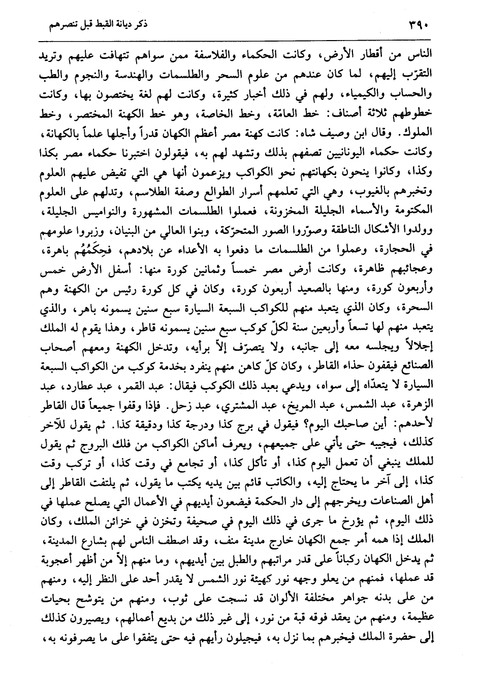 الناس من أقطار الأرض، وكانت الحكماء والفلاسفة ممن سواهم تتهافت عليهم وتريد التقرّب إليهم، لما كان عندهم من علوم السحر والطلسمات والهندسة والنجوم والطب والحساب والكيمياء، ولهم في ذلك أخبار كثيرة، وكانت لهم لغة يختصون بها، وكانت خطوطهم ثلاثة أصناف: خط العامّة، وخط الخاصة، وهو خط الكهنة المختصر، وخط الملوك. وقال ابن وصيف شاه: كانت كهنة مصر أعظم الكهان قدرا وأجلها علما بالكهانة، وكانت حكماء اليونانيين تصفهم بذلك وتشهد لهم به، فيقولون اختبرنا حكماء مصر بكذا وكذا، وكانوا ينحون بكهانتهم نحو الكواكب ويزعمون أنها هي التي تفيض عليهم العلوم وتخبرهم بالغيوب، وهي التي تعلمهم أسرار الطوالع وصفة الطلاسم، وتدلهم على العلوم المكتومة والأسماء الجليلة المخزونة، فعملوا الطلسمات المشهورة والنواميس الجليلة، وولدوا الأشكال الناطقة وصوّروا الصور المتحرّكة، وبنوا العالي من البنيان، وزبروا علومهم في الحجارة، وعملوا من الطلسمات ما دفعوا به الأعداء عن بلادهم، فحكمهم باهرة، وعجائبهم ظاهرة، وكانت أرض مصر خمسا وثمانين كورة منها: أسفل الأرض خمس وأربعون كورة، ومنها بالصعيد أربعون كورة، وكان في كل كورة رئيس من الكهنة وهم السحرة، وكان الذي يتعبد منهم للكواكب السبعة السيارة سبع سنين يسمونه باهر، والذي يتعبد منهم لها تسعا وأربعين سنة لكلّ كوكب سبع سنين يسمونه قاطر، وهذا يقوم له الملك إجلالا ويجلسه معه إلى جانبه، ولا يتصرّف إلّا برأيه، وتدخل الكهنة ومعهم أصحاب الصنائع فيقفون حذاء القاطر، وكان كلّ كاهن منهم ينفرد بخدمة كوكب من الكواكب السبعة السيارة لا يتعدّاه إلى سواه، ويدعي بعبد ذلك الكوكب فيقال: عبد القمر، عبد عطارد، عبد الزهرة، عبد الشمس، عبد المريخ، عبد المشتري، عبد زحل. فإذا وقفوا جميعا قال القاطر لأحدهم: أين صاحبك اليوم؟ فيقول في برج كذا ودرجة كذا ودقيقة كذا. ثم يقول للآخر كذلك، فيجيبه حتى يأتي على جميعهم، ويعرف أماكن الكواكب من فلك البروج ثم يقول للملك ينبغي أن تعمل اليوم كذا، أو تأكل كذا، أو تجامع في وقت كذا، أو تركب وقت كذا، إلى آخر ما يحتاج إليه، والكاتب قائم بين يديه يكتب ما يقول، ثم يلتفت القاطر إلى أهل الصناعات ويخرجهم إلى دار الحكمة فيضعون أيديهم في الأعمال التي يصلح عملها في ذلك اليوم، ثم يؤرخ ما جرى في ذلك اليوم في صحيفة وتخزن في خزائن الملك، وكان الملك إذا همه أمر جمع الكهان خارج مدينة منف، وقد اصطف الناس لهم بشارع المدينة، ثم يدخل الكهان ركبانا على قدر مراتبهم والطبل بين أيديهم، وما منهم إلّا من أظهر أعجوبة قد عملها، فمنهم من يعلو وجهه نور كهيئة نور الشمس لا يقدر أحد على النظر إليه، ومنهم من على بدنه جواهر مختلفة الألوان قد نسجت على ثوب، ومنهم من يتوشح بحيات عظيمة، ومنهم من يعقد فوقه قبة من نور، إلى غير ذلك من بديع أعمالهم، ويصيرون كذلك إلى حضرة الملك فيخبرهم بما نزل به، فيجيلون رأيهم فيه حتى يتفقوا على ما يصرفونه به،