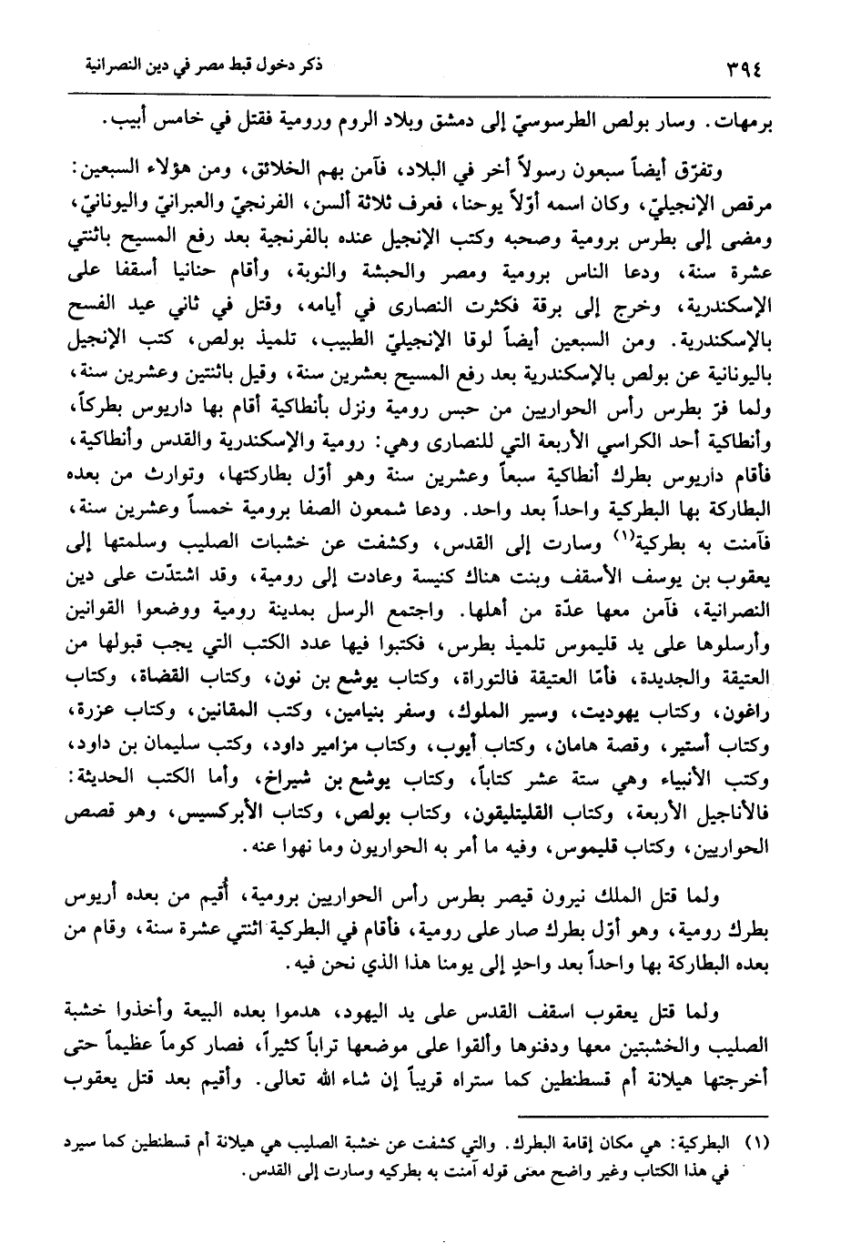 مرقص الإنجيليّ، وكان اسمه أوّلا يوحنا، فعرف ثلاثة ألسن، الفرنجيّ والعبرانيّ واليونانيّ، ومضى إلى بطرس برومية وصحبه وكتب الإنجيل عنده بالفرنجية بعد رفع المسيح باثنتي عشرة سنة، ودعا الناس برومية ومصر والحبشة والنوبة، وأقام حنانيا أسقفا على الإسكندرية، وخرج إلى برقة فكثرت النصارى في أيامه، وقتل في ثاني عيد الفسح بالإسكندرية. ومن السبعين أيضا لوقا الإنجيليّ الطبيب، تلميذ بولص، كتب الإنجيل باليونانية عن بولص بالإسكندرية بعد رفع المسيح بعشرين سنة، وقيل باثنتين وعشرين سنة، ولما فرّ بطرس رأس الحواريين من حبس رومية ونزل بأنطاكية أقام بها داريوس بطركا، وأنطاكية أحد الكراسي الأربعة التي للنصارى وهي: رومية والإسكندرية والقدس وأنطاكية، فأقام داريوس بطرك أنطاكية سبعا وعشرين سنة وهو أوّل بطاركتها، وتوارث من بعده البطاركة بها البطركية واحدا بعد واحد. ودعا شمعون الصفا برومية خمسا وعشرين سنة، فآمنت به بطركية «1» وسارت إلى القدس، وكشفت عن خشبات الصليب وسلمتها إلى يعقوب بن يوسف الأسقف وبنت هناك كنيسة وعادت إلى رومية، وقد اشتدّت على دين النصرانية، فآمن معها عدّة من أهلها. واجتمع الرسل بمدينة رومية ووضعوا القوانين وأرسلوها على يد قليموس تلميذ بطرس، فكتبوا فيها عدد الكتب التي يجب قبولها من العتيقة والجديدة، فأمّا العتيقة فالتوراة، وكتاب يوشع بن نون، وكتاب القضاة، وكتاب راغون، وكتاب يهوديت، وسير الملوك، وسفر بنيامين، وكتب المقانين، وكتاب عزرة، وكتاب أستير، وقصة هامان، وكتاب أيوب، وكتاب مزامير داود، وكتب سليمان بن داود، وكتب الأنبياء وهي ستة عشر كتابا، وكتاب يوشع بن شيراخ، وأما الكتب الحديثة:
