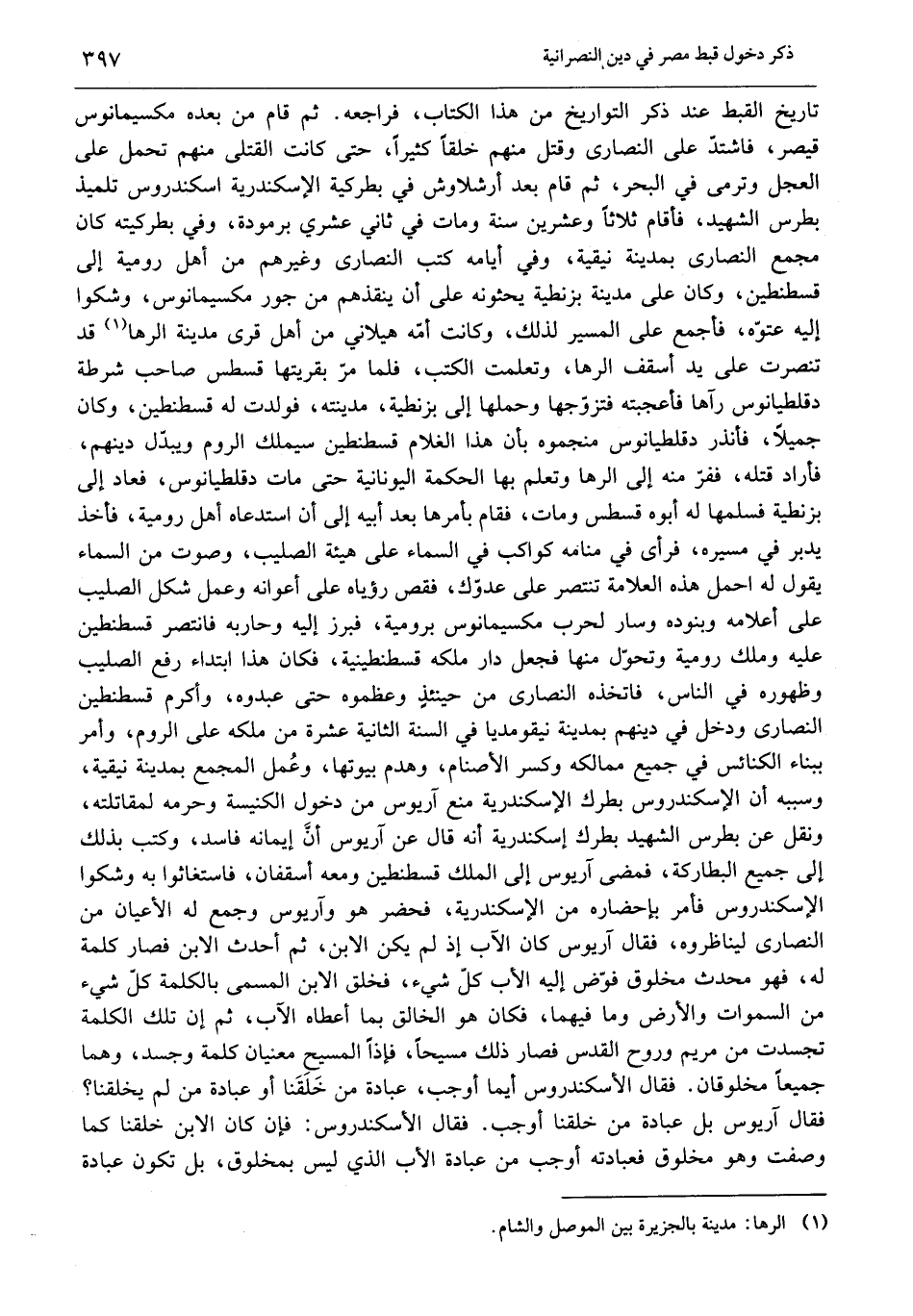 تاريخ القبط عند ذكر التواريخ من هذا الكتاب، فراجعه. ثم قام من بعده مكسيمانوس قيصر، فاشتدّ على النصارى وقتل منهم خلقا كثيرا، حتى كانت القتلى منهم تحمل على العجل وترمى في البحر، ثم قام بعد أرشلاوش في بطركية الإسكندرية اسكندروس تلميذ بطرس الشهيد، فأقام ثلاثا وعشرين سنة ومات في ثاني عشري برمودة، وفي بطركيته كان مجمع النصارى بمدينة نيقية، وفي أيامه كتب النصارى وغيرهم من أهل رومية إلى قسطنطين، وكان على مدينة بزنطية يحثونه على أن ينقذهم من جور مكسيمانوس، وشكوا إليه عتوّه، فأجمع على المسير لذلك، وكانت أمّه هيلاني من أهل قرى مدينة الرها «1» قد تنصرت على يد أسقف الرها، وتعلمت الكتب، فلما مرّ بقريتها قسطس صاحب شرطة دقلطيانوس رآها فأعجبته فتزوّجها وحملها إلى بزنطية، مدينته، فولدت له قسطنطين، وكان جميلا، فأنذر دقلطيانوس منجموه بأن هذا الغلام قسطنطين سيملك الروم ويبدّل دينهم، فأراد قتله، ففرّ منه إلى الرها وتعلم بها الحكمة اليونانية حتى مات دقلطيانوس، فعاد إلى بزنطية فسلمها له أبوه قسطس ومات، فقام بأمرها بعد أبيه إلى أن استدعاه أهل رومية، فأخذ يدبر في مسيره، فرأى في منامه كواكب في السماء على هيئة الصليب، وصوت من السماء يقول له احمل هذه العلامة تنتصر على عدوّك، فقص رؤياه على أعوانه وعمل شكل الصليب على أعلامه وبنوده وسار لحرب مكسيمانوس برومية، فبرز إليه وحاربه فانتصر قسطنطين عليه وملك رومية وتحوّل منها فجعل دار ملكه قسطنطينية، فكان هذا ابتداء رفع الصليب وظهوره في الناس، فاتخذه النصارى من حينئذ وعظموه حتى عبدوه، وأكرم قسطنطين النصارى ودخل في دينهم بمدينة نيقومديا في السنة الثانية عشرة من ملكه على الروم، وأمر ببناء الكنائس في جميع ممالكه وكسر الأصنام، وهدم بيوتها، وعمل المجمع بمدينة نيقية، وسببه أن الإسكندروس بطرك الإسكندرية منع آريوس من دخول الكنيسة وحرمه لمقاتلته، ونقل عن بطرس الشهيد بطرك إسكندرية أنه قال عن آريوس أنّ إيمانه فاسد، وكتب بذلك إلى جميع البطاركة، فمضى آريوس إلى الملك قسطنطين ومعه أسقفان، فاستغاثوا به وشكوا الإسكندروس فأمر بإحضاره من الإسكندرية، فحضر هو وآريوس وجمع له الأعيان من النصارى ليناظروه، فقال آريوس كان الأب إذ لم يكن الابن، ثم أحدث الابن فصار كلمة له، فهو محدث مخلوق فوّض إليه الأب كلّ شيء، فخلق الابن المسمى بالكلمة كلّ شيء من السماوات والأرض وما فيهما، فكان هو الخالق بما أعطاه الأب، ثم إن تلك الكلمة تجسدت من مريم وروح القدس فصار ذلك مسيحا، فإذا المسيح معنيان كلمة وجسد، وهما جميعا مخلوقان. فقال الإسكندروس أيما أوجب، عبادة من خلقنا أو عبادة من لم يخلقنا؟