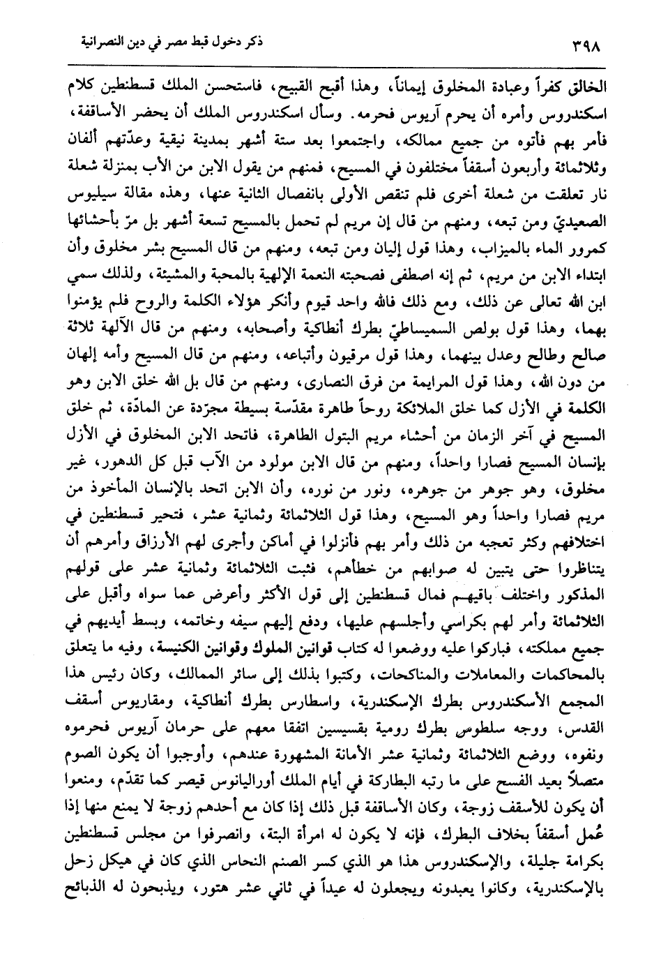 الخالق كفرا وعبادة المخلوق إيمانا، وهذا أقبح القبيح، فاستحسن الملك قسطنطين كلام اسكندروس وأمره أن يحرم آريوس فحرمه. وسأل اسكندروس الملك أن يحضر الأساقفة، فأمر بهم فأتوه من جميع ممالكه، واجتمعوا بعد ستة أشهر بمدينة نيقية وعدّتهم ألفان وثلاثمائة وأربعون أسقفا مختلفون في المسيح، فمنهم من يقول الابن من الأب بمنزلة شعلة نار تعلقت من شعلة أخرى فلم تنقص الأولى بانفصال الثانية عنها، وهذه مقالة سيليوس الصعيديّ ومن تبعه، ومنهم من قال إن مريم لم تحمل بالمسيح تسعة أشهر بل مرّ بأحشائها كمرور الماء بالميزاب، وهذا قول إليان ومن تبعه، ومنهم من قال المسيح بشر مخلوق وأن ابتداء الابن من مريم، ثم إنه اصطفى فصحبته النعمة الإلهية بالمحبة والمشيئة، ولذلك سمي ابن الله تعالى عن ذلك، ومع ذلك فالله واحد قيوم وأنكر هؤلاء الكلمة والروح فلم يؤمنوا بهما، وهذا قول بولص السميساطيّ بطرك أنطاكية وأصحابه، ومنهم من قال الآلهة ثلاثة صالح وطالح وعدل بينهما، وهذا قول مرقيون وأتباعه، ومنهم من قال المسيح وأمه إلهان من دون الله، وهذا قول المرائمة من فرق النصارى، ومنهم من قال بل الله خلق الابن وهو الكلمة في الأزل كما خلق الملائكة روحا طاهرة مقدّسة بسيطة مجرّدة عن المادّة، ثم خلق المسيح في آخر الزمان من أحشاء مريم البتول الطاهرة، فاتحد الابن المخلوق في الأزل بإنسان المسيح فصارا واحدا، ومنهم من قال الابن مولود من الأب قبل كل الدهور، غير مخلوق، وهو جوهر من جوهره، ونور من نوره، وأن الابن اتحد بالإنسان المأخوذ من مريم فصارا واحدا وهو المسيح، وهذا قول الثلاثمائة وثمانية عشر، فتحير قسطنطين في اختلافهم وكثر تعجبه من ذلك وأمر بهم فأنزلوا في أماكن وأجرى لهم الأرزاق وأمرهم أن يتناظروا حتى يتبين له صوابهم من خطأهم، فثبت الثلاثمائة وثمانية عشر على قولهم المذكور واختلف باقيهم فمال قسطنطين إلى قول الأكثر وأعرض عما سواه وأقبل على الثلاثمائة وأمر لهم بكراسي وأجلسهم عليها، ودفع إليهم سيفه وخاتمه، وبسط أيديهم في جميع مملكته، فباركوا عليه ووضعوا له كتاب قوانين الملوك وقوانين الكنيسة، وفيه ما يتعلق بالمحاكمات والمعاملات والمناكحات، وكتبوا بذلك إلى سائر المماليك، وكان رئيس هذا المجمع الإسكندروس بطرك الإسكندرية، واسطارس بطرك أنطاكية، ومقاريوس أسقف القدس، ووجه سلطوس بطرك رومية بقسيسين اتفقا معهم على حرمان آريوس فحرموه ونفوه، ووضع الثلاثمائة وثمانية عشر الأمانة المشهورة عندهم، وأوجبوا أن يكون الصوم متصلا بعيد الفسح على ما رتبه البطاركة في أيام الملك أوراليانوس قيصر كما تقدّم، ومنعوا أن يكون للأسقف زوجة، وكان الأساقفة قبل ذلك إذا كان مع أحدهم زوجة لا يمنع منها إذا عمل أسقفا بخلاف البطرك، فإنه لا يكون له امرأة البتة، وانصرفوا من مجلس قسطنطين بكرامة جليلة، والإسكندروس هذا هو الذي كسر الصنم النحاس الذي كان في هيكل زحل بالإسكندرية، وكانوا يعبدونه ويجعلون له عيدا في ثاني عشر هتور، ويذبحون له الذبائح