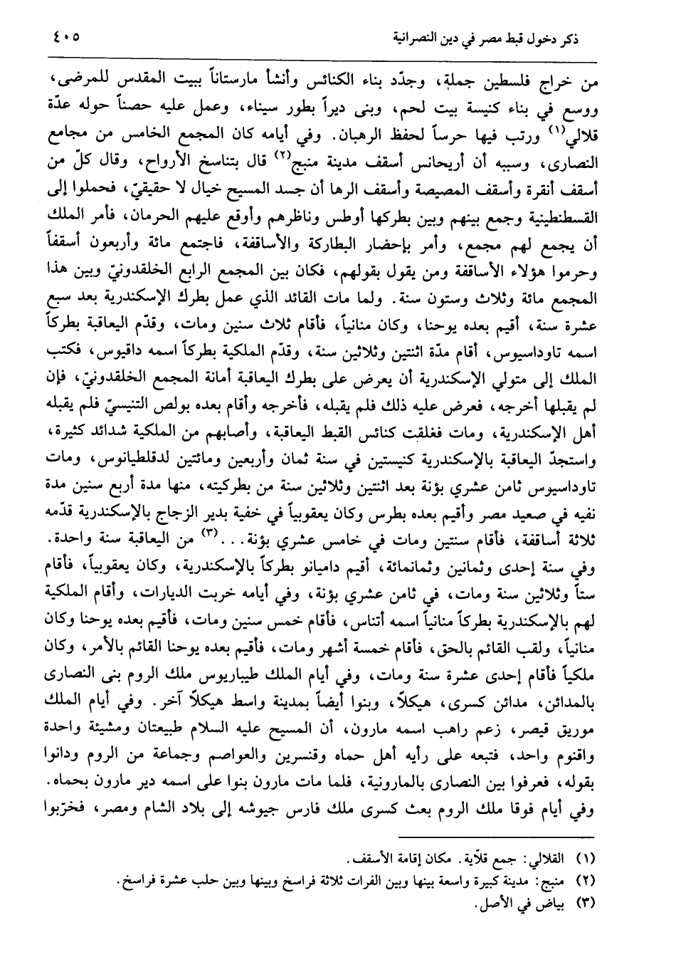 من خراج فلسطين جملة، وجدّد بناء الكنائس وأنشأ مارستانا ببيت المقدس للمرضى، ووسع في بناء كنيسة بيت لحم، وبنى ديرا بطور سيناء، وعمل عليه حصنا حوله عدّة قلالي «1» ورتب فيها حرسا لحفظ الرهبان. وفي أيامه كان المجمع الخامس من مجامع النصارى، وسببه أن أريحانس أسقف مدينة منبج «2» قال بتناسخ الأرواح، وقال كلّ من أسقف أنقرة وأسقف المصيصة وأسقف الرها أن جسد المسيح خيال لا حقيقيّ، فحملوا إلى القسطنطينية وجمع بينهم وبين بطركها أوطس وناظرهم وأوقع عليهم الحرمان، فأمر الملك أن يجمع لهم مجمع، وأمر بإحضار البطاركة والأساقفة، فاجتمع مائة وأربعون أسقفا وحرموا هؤلاء الأساقفة ومن يقول بقولهم، فكان بين المجمع الرابع الخلقدونيّ وبين هذا المجمع مائة وثلاث وستون سنة. ولما مات القائد الذي عمل بطرك الإسكندرية بعد سبع عشرة سنة، أقيم بعده يوحنا، وكان منانيا، فأقام ثلاث سنين ومات، وقدّم اليعاقبة بطركا اسمه تاوداسيوس، أقام مدّة اثنتين وثلاثين سنة، وقدّم الملكية بطركا اسمه داقيوس، فكتب الملك إلى متولي الإسكندرية أن يعرض على بطرك اليعاقبة أمانة المجمع الخلقدونيّ، فإن لم يقبلها أخرجه، فعرض عليه ذلك فلم يقبله، فأخرجه وأقام بعده بولص التنيسيّ فلم يقبله أهل الإسكندرية، ومات فغلقت كنائس القبط اليعاقبة، وأصابهم من الملكية شدائد كثيرة، واستجدّ اليعاقبة بالإسكندرية كنيستين في سنة ثمان وأربعين ومائتين لدقلطيانوس، ومات تاوداسيوس ثامن عشري بؤنة بعد اثنتين وثلاثين سنة من بطركيته، منها مدة أربع سنين مدة نفيه في صعيد مصر وأقيم بعده بطرس وكان يعقوبيا في خفية بدير الزجاج بالإسكندرية قدّمه ثلاثة أساقفة، فأقام سنتين ومات في خامس عشري بؤنة ... «3» من اليعاقبة سنة واحدة.
