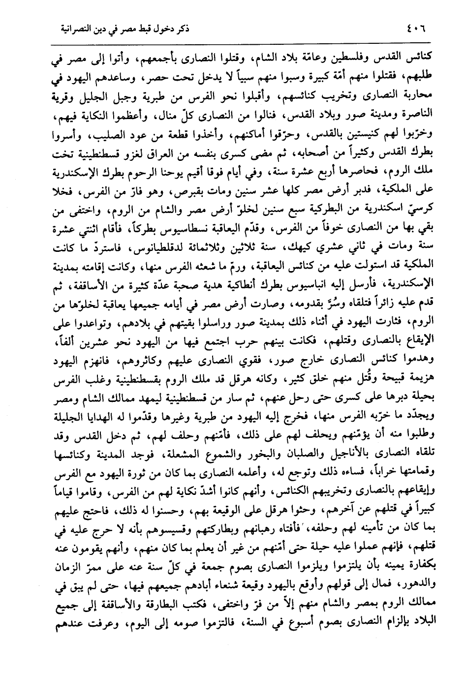 كنائس القدس وفلسطين وعامّة بلاد الشام، وقتلوا النصارى بأجمعهم، وأتوا إلى مصر في طلبهم، فقتلوا منهم أمّة كبيرة وسبوا منهم سبيا لا يدخل تحت حصر، وساعدهم اليهود في محاربة النصارى وتخريب كنائسهم، وأقبلوا نحو الفرس من طبرية وجبل الجليل وقرية الناصرة ومدينة صور وبلاد القدس، فنالوا من النصارى كلّ منال، وأعظموا النكاية فيهم، وخرّبوا لهم كنيستين بالقدس، وحرّقوا أماكنهم، وأخذوا قطعة من عود الصليب، وأسروا بطرك القدس وكثيرا من أصحابه، ثم مضى كسرى بنفسه من العراق لغزو قسطنطينية تخت ملك الروم، فحاصرها أربع عشرة سنة، وفي أيام فوقا أقيم يوحنا الرحوم بطرك الإسكندرية على الملكية، فدبر أرض مصر كلها عشر سنين ومات بقبرص، وهو فارّ من الفرس، فخلا كرسيّ اسكندرية من البطركية سبع سنين لخلوّ أرض مصر والشام من الروم، واختفى من بقي بها من النصارى خوفا من الفرس، وقدّم اليعاقبة نسطاسيوس بطركا، فأقام اثنتي عشرة سنة ومات في ثاني عشري كيهك، سنة ثلاثين وثلاثمائة لدقلطيانوس، فاستردّ ما كانت الملكية قد استولت عليه من كنائس اليعاقبة، ورمّ ما شعثه الفرس منها، وكانت إقامته بمدينة الإسكندرية، فأرسل إليه انباسيوس بطرك أنطاكية هدية صحبة عدّة كثيرة من الأساقفة، ثم قدم عليه زائرا فتلقاه وسرّ بقدومه، وصارت أرض مصر في أيامه جميعها يعاقبة لخلوّها من الروم، فثارت اليهود في أثناء ذلك بمدينة صور وراسلوا بقيتهم في بلادهم، وتواعدوا على الإيقاع بالنصارى وقتلهم، فكانت بينهم حرب اجتمع فيها من اليهود نحو عشرين ألفا، وهدموا كنائس النصارى خارج صور، فقوي النصارى عليهم وكاثروهم، فانهزم اليهود هزيمة قبيحة وقتل منهم خلق كثير، وكانه هرقل قد ملك الروم بقسطنطينية وغلب الفرس بحيلة دبرها على كسرى حتى رحل عنهم، ثم سار من قسطنطينية ليمهد ممالك الشام ومصر ويجدّد ما خرّبه الفرس منها، فخرج إليه اليهود من طبرية وغيرها وقدّموا له الهدايا الجليلة وطلبوا منه أن يؤمّنهم ويحلف لهم على ذلك، فأمّنهم وحلف لهم، ثم دخل القدس وقد تلقاه النصارى بالأناجيل والصلبان والبخور والشموع المشعلة، فوجد المدينة وكنائسها وقمامتها خرابا، فساءه ذلك وتوجع له، وأعلمه النصارى بما كان من ثورة اليهود مع الفرس وإيقاعهم بالنصارى وتخريبهم الكنائس، وأنهم كانوا أشدّ نكاية لهم من الفرس، وقاموا قياما كبيرا في قتلهم عن آخرهم، وحثوا هرقل على الوقيعة بهم، وحسنوا له ذلك، فاحتج عليهم بما كان من تأمينه لهم وحلفه، فأفتاه رهبانهم وبطاركتهم وقسيسوهم بأنه لا حرج عليه في قتلهم، فإنهم عملوا عليه حيلة حتى أمّنهم من غير أن يعلم بما كان منهم، وأنهم يقومون عنه بكفارة يمينه بأن يلتزموا ويلزموا النصارى بصوم جمعة في كلّ سنة عنه على ممرّ الزمان والدهور، فمال إلى قولهم وأوقع باليهود وقيعة شنعاء أبادهم جميعهم فيها، حتى لم يبق في ممالك الروم بمصر والشام منهم إلّا من فرّ واختفى، فكتب البطارقة والأساقفة إلى جميع البلاد بإلزام النصارى بصوم أسبوع في السنة، فالتزموا صومه إلى اليوم، وعرفت عندهم