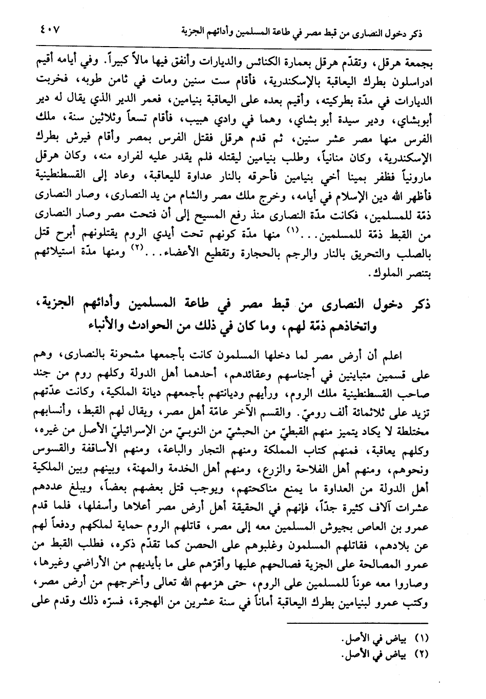 ذكر دخول النصارى من قبط مصر في طاعة المسلمين وأدائهم الجزية، واتخاذهم ذمّة لهم، وما كان في ذلك من الحوادث والأنباء