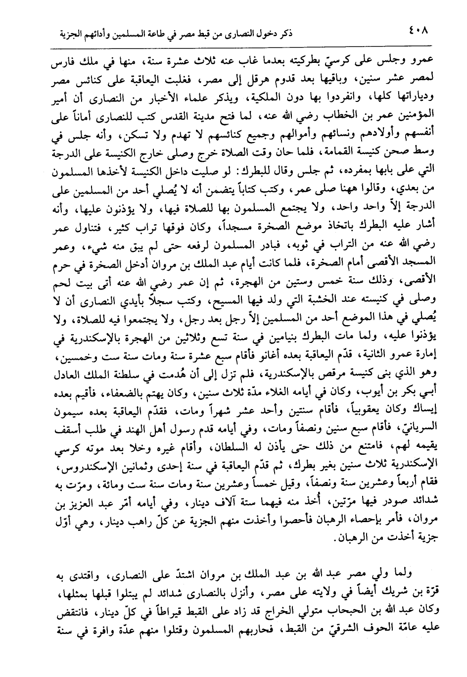 عمرو وجلس على كرسيّ بطركيته بعد ما غاب عنه ثلاث عشرة سنة، منها في ملك فارس لمصر عشر سنين، وباقيها بعد قدوم هرقل إلى مصر، فغلبت اليعاقبة على كنائس مصر ودياراتها كلها، وانفردوا بها دون الملكية، ويذكر علماء الأخبار من النصارى أن أمير المؤمنين عمر بن الخطاب رضي الله عنه، لما فتح مدينة القدس كتب للنصارى أمانا على أنفسهم وأولادهم ونسائهم وأموالهم وجميع كنائسهم لا تهدم ولا تسكن، وأنه جلس في وسط صحن كنيسة القمامة، فلما حان وقت الصلاة خرج وصلّى خارج الكنيسة على الدرجة التي على بابها بمفرده، ثم جلس وقال للبطرك: لو صليت داخل الكنيسة لأخذها المسلمون من بعدي، وقالوا ههنا صلّى عمر، وكتب كتابا يتضمن أنه لا يصلي أحد من المسلمين على الدرجة إلّا واحد واحد، ولا يجتمع المسلمون بها للصلاة فيها، ولا يؤذنون عليها، وأنه أشار عليه البطرك باتخاذ موضع الصخرة مسجدا، وكان فوقها تراب كثير، فتناول عمر رضي الله عنه من التراب في ثوبه، فبادر المسلمون لرفعه حتى لم يبق منه شيء، وعمر المسجد الأقصى أمام الصخرة، فلما كانت أيام عبد الملك بن مروان أدخل الصخرة في حرم الأقصى، وذلك سنة خمس وستين من الهجرة، ثم إن عمر رضي الله عنه أتى بيت لحم وصلّى في كنيسته عند الخشبة التي ولد فيها المسيح، وكتب سجلا بأيدي النصارى أن لا يصلي في هذا الموضع أحد من المسلمين إلّا رجل بعد رجل، ولا يجتمعوا فيه للصلاة، ولا يؤذنوا عليه، ولما مات البطرك بنيامين في سنة تسع وثلاثين من الهجرة بالإسكندرية في إمارة عمرو الثانية، قدّم اليعاقبة بعده أغانو فأقام سبع عشرة سنة ومات سنة ست وخمسين، وهو الذي بنى كنيسة مرقص بالإسكندرية، فلم تزل إلى أن هدمت في سلطنة الملك العادل أبي بكر بن أيوب، وكان في أيامه الغلاء مدّة ثلاث سنين، وكان يهتم بالضعفاء، فأقيم بعده إيساك وكان يعقوبيا، فأقام سنتين وأحد عشر شهرا ومات، فقدّم اليعاقبة بعده سيمون السريانيّ، فأقام سبع سنين ونصفا ومات، وفي أيامه قدم رسول أهل الهند في طلب أسقف يقيمه لهم، فامتنع من ذلك حتى يأذن له السلطان، وأقام غيره وخلا بعد موته كرسي الإسكندرية ثلاث سنين بغير بطرك، ثم قدّم اليعاقبة في سنة إحدى وثمانين الإسكندروس، فقام أربعا وعشرين سنة ونصفا، وقيل خمسا وعشرين سنة ومات سنة ست ومائة، ومرّت به شدائد صودر فيها مرّتين، أخذ منه فيهما ستة آلاف دينار، وفي أيامه أمّر عبد العزيز بن مروان، فأمر بإحصاء الرهبان فأحصوا وأخذت منهم الجزية عن كلّ راهب دينار، وهي أوّل جزية أخذت من الرهبان.