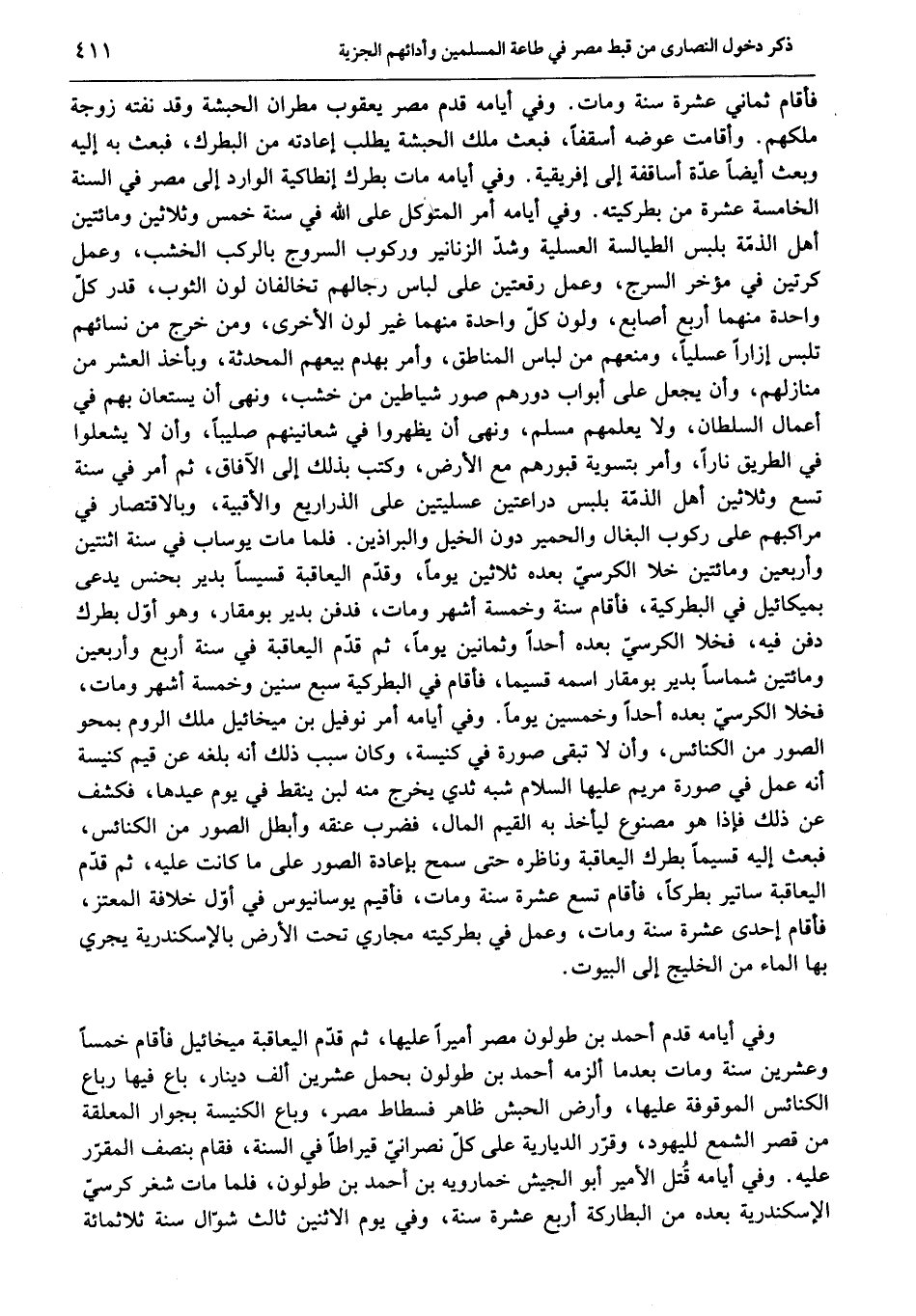 فأقام ثماني عشرة سنة ومات. وفي أيامه قدم مصر يعقوب مطران الحبشة وقد نفته زوجة ملكهم. وأقامت عوضه أسقفا، فبعث ملك الحبشة يطلب إعادته من البطرك، فبعث به إليه وبعث أيضا عدّة أساقفة إلى إفريقية. وفي أيامه مات بطرك أنطاكية الوارد إلى مصر في السنة الخامسة عشرة من بطركيته. وفي أيامه أمر المتوكل على الله في سنة خمس وثلاثين ومائتين أهل الذمّة بلبس الطيالسة العسلية وشدّ الزنانير وركوب السروج بالركب الخشب، وعمل كرتين في مؤخر السرج، وعمل رقعتين على لباس رجالهم تخالفان لون الثوب، قدر كلّ واحدة منهما أربع أصابع، ولون كلّ واحدة منهما غير لون الأخرى، ومن خرج من نسائهم تلبس إزارا عسليا، ومنعهم من لباس المناطق، وأمر بهدم بيعهم المحدثة، وبأخذ العشر من منازلهم، وأن يجعل على أبواب دورهم صور شياطين من خشب، ونهى أن يستعان بهم في أعمال السلطان، ولا يعلمهم مسلم، ونهى أن يظهروا في شعانينهم صليبا، وأن لا يشعلوا في الطريق نارا، وأمر بتسوية قبورهم مع الأرض، وكتب بذلك إلى الآفاق، ثم أمر في سنة تسع وثلاثين أهل الذمّة بلبس دراعتين عسليتين على الذراريع والأقبية، وبالاقتصار في مراكبهم على ركوب البغال والحمير دون الخيل والبراذين. فلما مات يوساب في سنة اثنتين وأربعين ومائتين خلا الكرسيّ بعده ثلاثين يوما، وقدّم اليعاقبة قسيسا بدير بحنس يدعى بميكائيل في البطركية، فأقام سنة وخمسة أشهر ومات، فدفن بدير بومقار، وهو أوّل بطرك دفن فيه، فخلا الكرسيّ بعده أحدا وثمانين يوما، ثم قدّم اليعاقبة في سنة أربع وأربعين ومائتين شماسا بدير بومقار اسمه قسيما، فأقام في البطركية سبع سنين وخمسة أشهر ومات، فخلا الكرسيّ بعده أحدا وخمسين يوما. وفي أيامه أمر نوفيل بن ميخائيل ملك الروم بمحو الصور من الكنائس، وأن لا تبقى صورة في كنيسة، وكان سبب ذلك أنه بلغه عن قيم كنيسة أنه عمل في صورة مريم عليها السلام شبه ثدي يخرج منه لبن ينقط في يوم عيدها، فكشف عن ذلك فإذا هو مصنوع ليأخذ به القيم المال، فضرب عنقه وأبطل الصور من الكنائس، فبعث إليه قسيما بطرك اليعاقبة وناظره حتى سمح بإعادة الصور على ما كانت عليه، ثم قدّم اليعاقبة ساتير بطركا، فأقام تسع عشرة سنة ومات، فأقيم يوسانيوس في أوّل خلافة المعتز، فأقام إحدى عشرة سنة ومات، وعمل في بطركيته مجاري تحت الأرض بالإسكندرية يجري بها الماء من الخليج إلى البيوت.