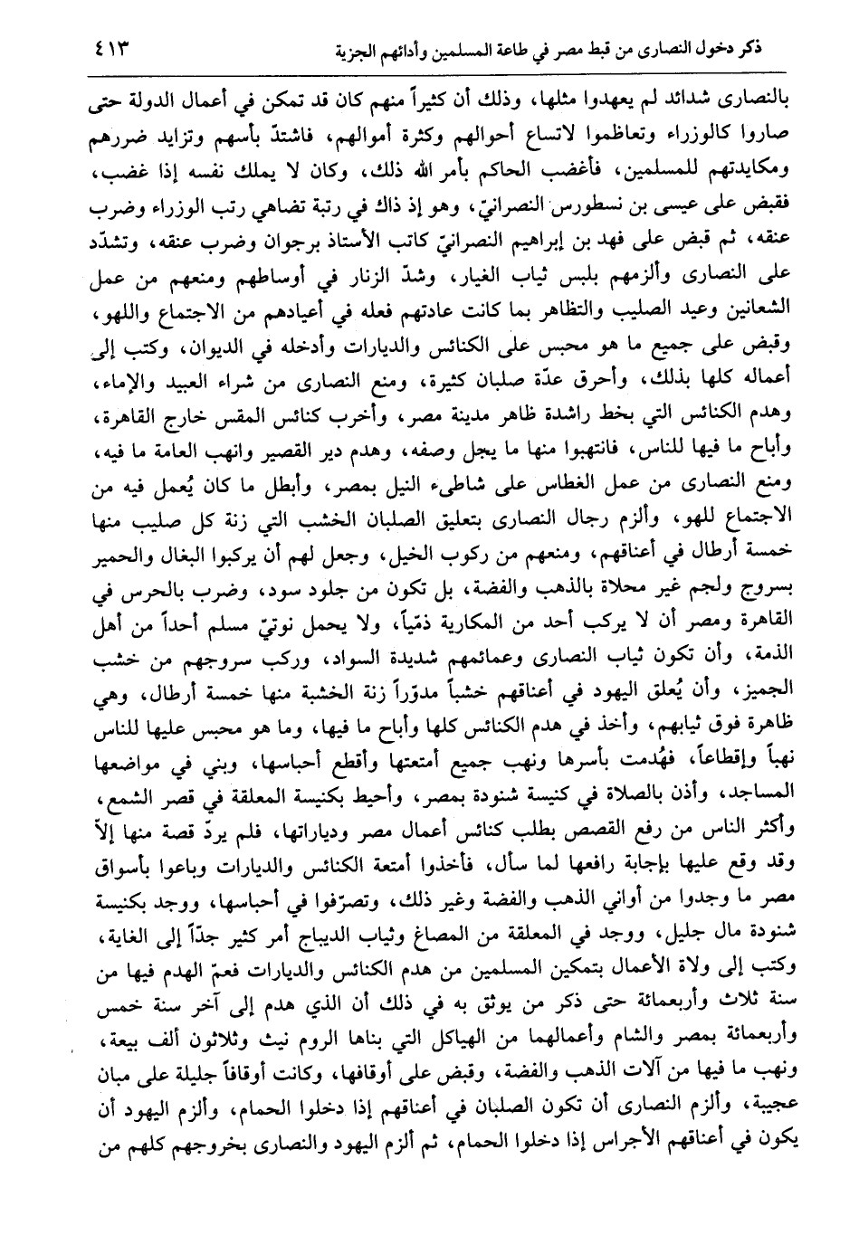 بالنصارى شدائد لم يعهدوا مثلها، وذلك أن كثيرا منهم كان قد تمكن في أعمال الدولة حتى صاروا كالوزراء وتعاظموا لاتساع أحوالهم وكثرة أموالهم، فاشتدّ بأسهم وتزايد ضررهم ومكايدتهم للمسلمين، فأغضب الحاكم بأمر الله ذلك، وكان لا يملك نفسه إذا غضب، فقبض على عيسى بن نسطورس النصرانيّ، وهو إذ ذاك في رتبة تضاهي رتب الوزراء وضرب عنقه، ثم قبض على فهد بن إبراهيم النصرانيّ كاتب الأستاذ برجوان وضرب عنقه، وتشدّد على النصارى وألزمهم بلبس ثياب الغيار، وشدّ الزنار في أوساطهم ومنعهم من عمل الشعانين وعيد الصليب والتظاهر بما كانت عادتهم فعله في أعيادهم من الاجتماع واللهو، وقبض على جميع ما هو محبس على الكنائس والديارات وأدخله في الديوان، وكتب إلى أعماله كلها بذلك، وأحرق عدّة صلبان كثيرة، ومنع النصارى من شراء العبيد والإماء، وهدم الكنائس التي بخط راشدة ظاهر مدينة مصر، وأخرب كنائس المقس خارج القاهرة، وأباح ما فيها للناس، فانتهبوا منها ما يجل وصفه، وهدم دير القصير وانهب العامة ما فيه، ومنع النصارى من عمل الغطاس على شاطىء النيل بمصر، وأبطل ما كان يعمل فيه من الاجتماع للهو، وألزم رجال النصارى بتعليق الصلبان الخشب التي زنة كل صليب منها خمسة أرطال في أعناقهم، ومنعهم من ركوب الخيل، وجعل لهم أن يركبوا البغال والحمير بسروج ولجم غير محلاة بالذهب والفضة، بل تكون من جلود سود، وضرب بالحرس في القاهرة ومصر أن لا يركب أحد من المكارية ذمّيا، ولا يحمل نوتيّ مسلم أحدا من أهل الذمة، وأن تكون ثياب النصارى وعمائهم شديدة السواد، وركب سروجهم من خشب الجميز، وأن يعلق اليهود في أعناقهم خشبا مدوّرا زنة الخشبة منها خمسة أرطال، وهي ظاهرة فوق ثيابهم، وأخذ في هدم الكنائس كلها وأباح ما فيها، وما هو محبس عليها للناس نهبا وإقطاعا، فهدمت بأسرها ونهب جميع أمتعتها وأقطع أحباسها، وبني في مواضعها المساجد، وأذن بالصلاة في كنيسة شنودة بمصر، وأحيط بكنيسة المعلقة في قصر الشمع، وأكثر الناس من رفع القصص بطلب كنائس أعمال مصر ودياراتها، فلم يردّ قصة منها إلّا وقد وقع عليها بإجابة رافعها لما سأل، فأخذوا أمتعة الكنائس والديارات وباعوا بأسواق مصر ما وجدوا من أواني الذهب والفضة وغير ذلك، وتصرّفوا في أحباسها، ووجد بكنيسة شنودة مال جليل، ووجد في المعلقة من المصاغ وثياب الديباج أمر كثير جدّا إلى الغاية، وكتب إلى ولاة الأعمال بتمكين المسلمين من هدم الكنائس والديارات فعمّ الهدم فيها من سنة ثلاث وأربعمائة حتى ذكر من يوثق به في ذلك أن الذي هدم إلى آخر سنة خمس وأربعمائة بمصر والشام وأعمالهما من الهياكل التي بناها الروم نيث وثلاثون ألف بيعة، ونهب ما فيها من آلات الذهب والفضة، وقبض على أوقافها، وكانت أوقافا جليلة على مبان عجيبة، وألزم النصارى أن تكون الصلبان في أعناقهم إذا دخلوا الحمام، وألزم اليهود أن يكون في أعناقهم الأجراس إذا دخلوا الحمام، ثم ألزم اليهود والنصارى بخروجهم كلهم من