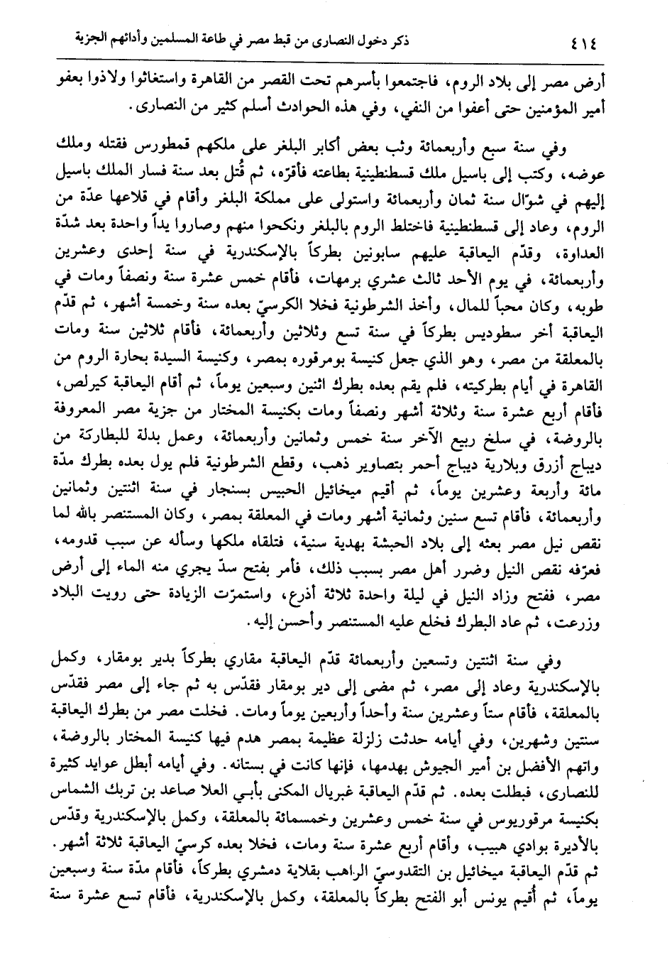 وفي سنة سبع وأربعمائة وثب بعض أكابر البلغر على ملكهم قمطورس فقتله وملك عوضه، وكتب إلى باسيل ملك قسطنطينية بطاعته فأقرّه، ثم قتل بعد سنة فسار الملك باسيل إليهم في شوّال سنة ثمان وأربعمائة واستولى على مملكة البلغر وأقام في قلاعها عدّة من الروم، وعاد إلى قسطنطينية فاختلط الروم بالبغر ونكحوا منهم وصاروا يدا واحدة بعد شدّة العداوة، وقدّم اليعاقبة عليهم سابونين بطركا بالإسكندرية في سنة إحدى وعشرين وأربعمائة، في يوم الأحد ثالث عشري برمهات، فأقام خمس عشرة سنة ونصفا ومات في طوبه، وكان محبا للمال، وأخذ الشرطونية فخلا الكرسيّ بعده سنة وخمسة أشهر، ثم قدّم اليعاقبة أخر سطوديس بطركا في سنة تسع وثلاثين وأربعمائة، فأقام ثلاثين سنة ومات بالمعلقة من مصر، وهو الذي جعل كنيسة بومرقوره بمصر، وكنيسة السيدة بحارة الروم من القاهرة في أيام بطركيته، فلم يقم بعده بطرك اثنين وسبعين يوما، ثم أقام اليعاقبة كيرلص، فأقام أربع عشرة سنة وثلاثة أشهر ونصفا ومات بكنيسة المختار من جزية مصر المعروفة بالروضة، في سلخ ربيع الآخر سنة خمس وثمانين وأربعمائة، وعمل بدلة للبطاركة من ديباج أزرق وبلارية ديباج أحمر بتصاوير ذهب، وقطع الشرطونية فلم يول بعده بطرك مدّة مائة وأربعة وعشرين يوما، ثم أقيم ميخائيل الحبيس بسنجار في سنة اثنتين وثمانين وأربعمائة، فأقام تسع وسنين وثمانية أشهر ومات في المعلقة بمصر، وكان المستنصر بالله لما نقص نيل مصر بعثه إلى بلاد الحبشة بهدية سنية، فتلقاه ملكها وسأله عن سبب قدومه، فعرّفه نقص النيل وضرر أهل مصر بسبب ذلك، فأمر بفتح سدّ يجري منه الماء إلى أرض مصر، ففتح وزاد النيل في ليلة واحدة ثلاثة أذرع، واستمرّت الزيادة حتى رويت البلاد وزرعت، ثم عاد البطرك فخلع عليه المستنصر وأحسن إليه.