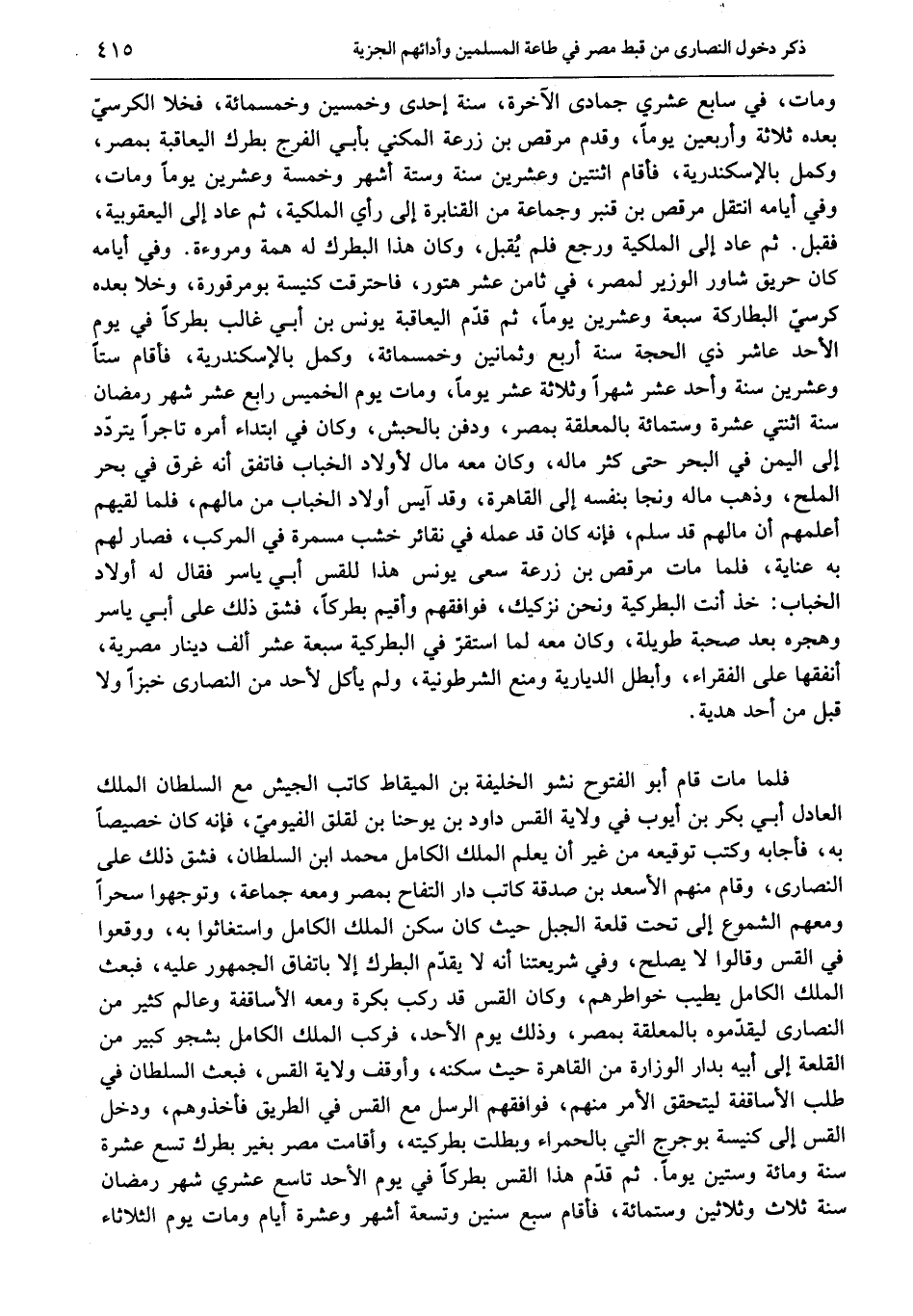 فلما مات قام أبو الفتوح نشو الخليفة بن الميقاط كاتب الجيش مع السلطان الملك العادل أبي بكر بن أيوب في ولاية القس داود بن يوحنا بن لقلق الفيوميّ، فإنه كان خصيصا به، فأجابه وكتب توقيعه من غير أن يعلم الملك الكامل محمد ابن السلطان، فشق ذلك على النصارى، وقام منهم الأسعد بن صدقة كاتب دار التفاح بمصر ومعه جماعة، وتوجهوا سحرا ومعهم الشموع إلى تحت قلعة الجبل حيث كان سكن الملك الكامل واستغاثوا به، ووقعوا في القس وقالوا لا يصلح، وفي شريعتنا أنه لا يقدّم البطرك إلا باتفاق الجمهور عليه، فبعث الملك الكامل يطيب خواطرهم، وكان القس قد ركب بكرة ومعه الأساقفة وعالم كثير من النصارى ليقدّموه بالمعلقة بمصر، وذلك يوم الأحد، فركب الملك الكامل بشجو كبير من القلعة إلى أبيه بدار الوزارة من القاهرة حيث سكنه، وأوقف ولاية القس، فبعث السلطان في طلب الأساقفة ليتحقق الأمر منهم، فوافقهم الرسل مع القس في الطريق فأخذوهم، ودخل القس إلى كنيسة بوجرج التي بالحمراء وبطلت بطركيته، وأقامت مصر بغير بطرك تسع عشرة سنة ومائة وستين يوما. ثم قدّم هذا القس بطركا في يوم الأحد تاسع عشري شهر رمضان سنة ثلاث وثلاثين وستمائة، فأقام سبع سنين وتسعة أشهر وعشرة أيام ومات يوم الثلاثاء
