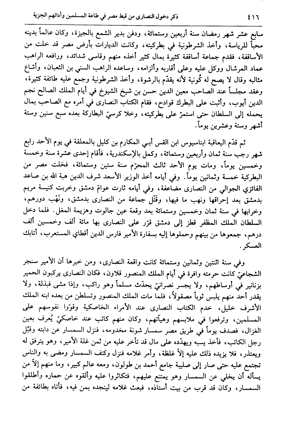 وفي سنة اثنتين وثمانين وستمائة كانت واقعة النصارى، ومن خبرها أن الأمير سنجر الشجاعيّ كانت حرمته وافرة في أيام الملك المنصور قلاون، فكان النصارى يركبون الحمير بزنانير في أوساطهم، ولا يجسر نصرانيّ يحدّث مسلما وهو راكب، وإذا مشى فبذلة، ولا يقدر أحد منهم يلبس ثوبا مصقولا، فلما مات الملك المنصور وتسلطن من بعده ابنه الملك الأشرف خليل، خدم الكتاب النصارى عند الأمراء الخاصكية وقوّوا نفوسهم على المسلمين، وترفعوا في ملابسهم وهيآتهم، وكان منهم كاتب عند خاصكيّ يعرف بعين الغزال، فصدف يوما في طريق مصر سمسار شونة مخدومه، فنزل السمسار عن دابته وقبّل رجل الكاتب، فأخذ يسبه ويهدّده على مال قد تأخر عليه من ثمن غلة الأمير، وهو يترفق له ويعتذر، فلا يزيده ذلك عليه إلّا غلظة، وأمر غلامه فنزل وكتف السمسار ومضى به والناس تجتمع عليه حتى صار إلى صليبة جامع أحمد بن طولون، ومعه عالم كبير، وما منهم إلّا من يسأله أن يخلي عن السمسار وهو يمتنع عليهم، فتكاثروا عليه وألقوه عن حماره وأطلقوا السمسار، وكان قد قرب من بيت أستاذه، فبعث غلامه لينجده بمن فيه، فأتاه بطائفة من